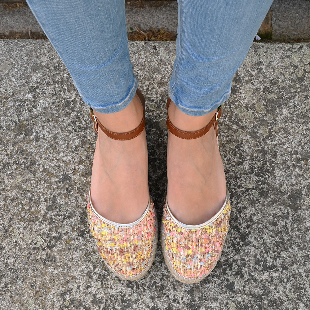 Imagina un festival acústico al caer la tarde, el sonido de una guitarra y la libertad de caminar sin prisa. Becky no es solo un calzado; es un homenaje a esa textura «tweed» multicolor que parece tejida con recuerdos de viajes y flores silvestres. Su borde dorado atrapa la última luz del día, mientras que su cuña de yute natural te mantiene conectada a la tierra, paso a paso.