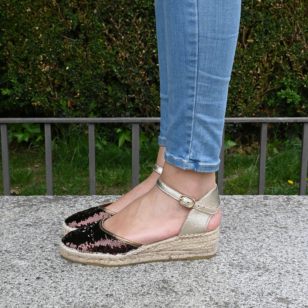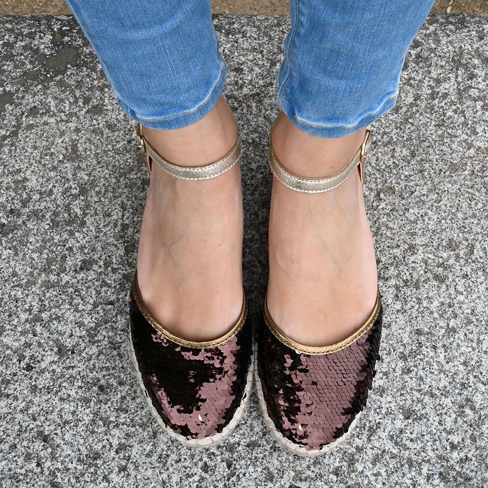 ✔︎ Zapato: Hechas a mano. Exterior en piel y tejido con lentejuelas cambiantes. Interior de tejido técnico.