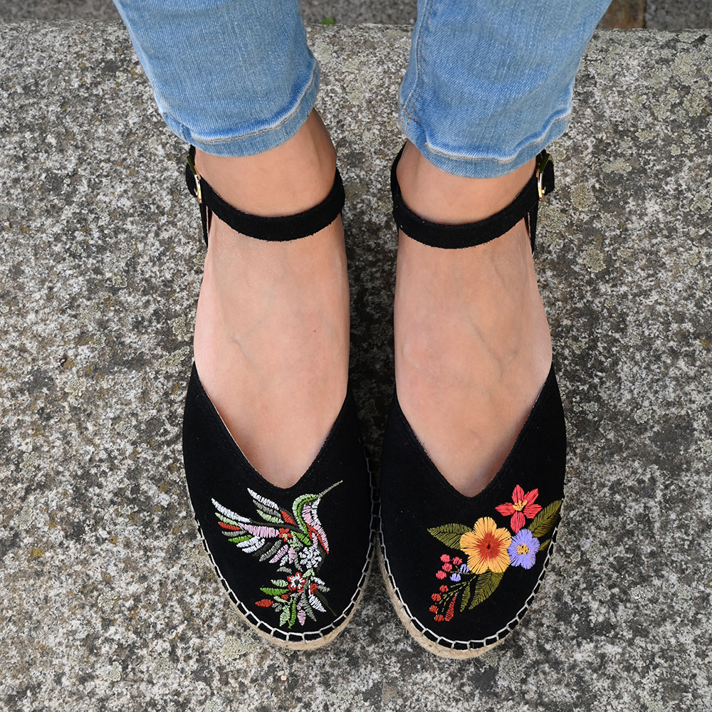 Imagina caminar con la esencia de un jardín a tus pies. Nuestras alpargatas Colibrí en color negro no son solo un accesorio, son una pequeña obra de arte que celebra la asimetría y la naturaleza.