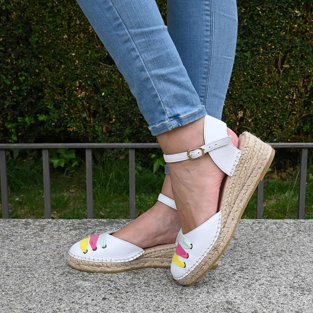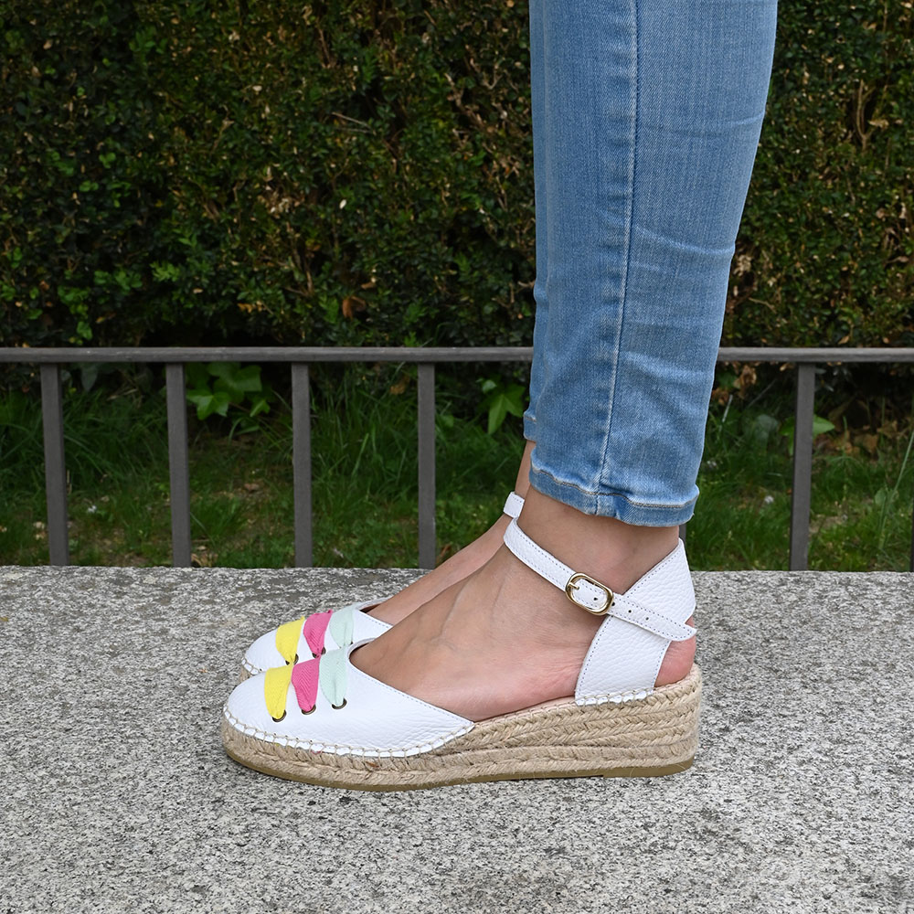 La alpargata Cordelia está inspirada en el nácar de los tesoros ocultos del océano. Su piel blanca de efecto rugoso y acabado perlado es un homenaje a la luz del mar. Un diseño que equilibra la naturalidad del yute con pinceladas de color que bailan en tu empeine; amarillo solar, fucsia coral y verde menta.