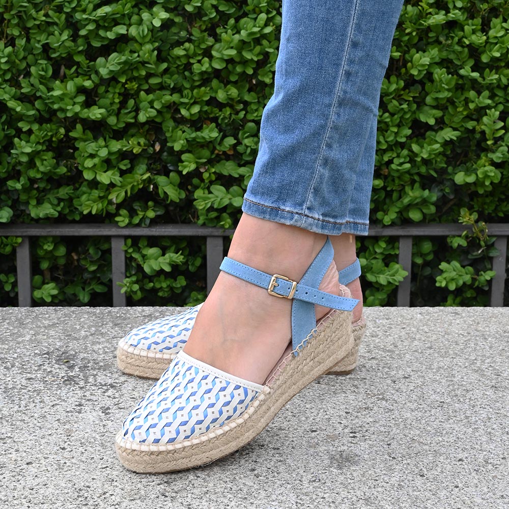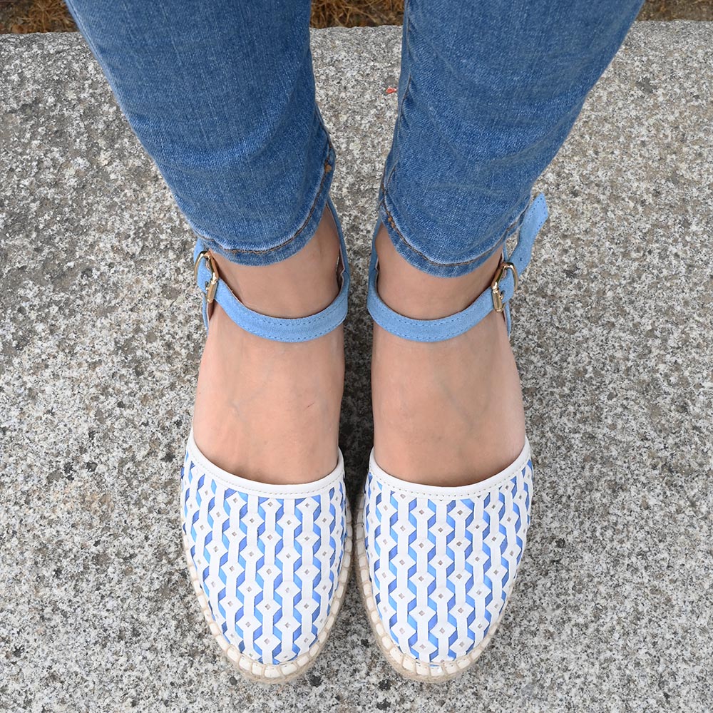 Su diseño destaca por una piel trenzada a mano y troquelada, donde el blanco puro se entrelaza con pinceladas de azul, recreando los matices de los riachuelos en plena naturaleza. La delicada tira de serraje a juego con las cintas de raso, abraza el tobillo con la suavidad de una caricia, proporcionando una sujeción segura, con hebilla y elástico, sin perder la ligereza que define a este nombre.