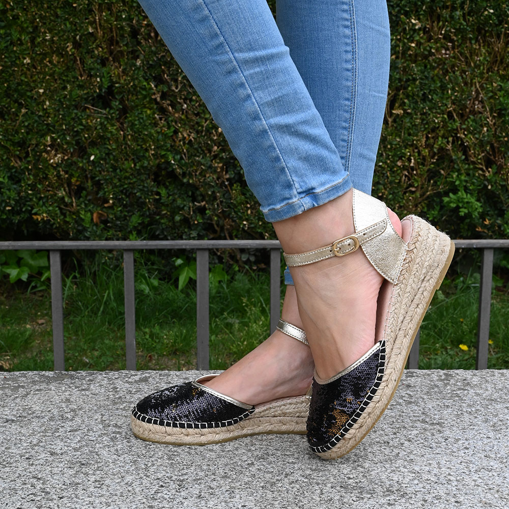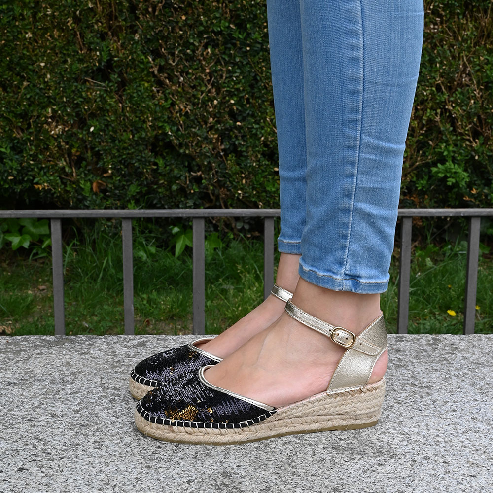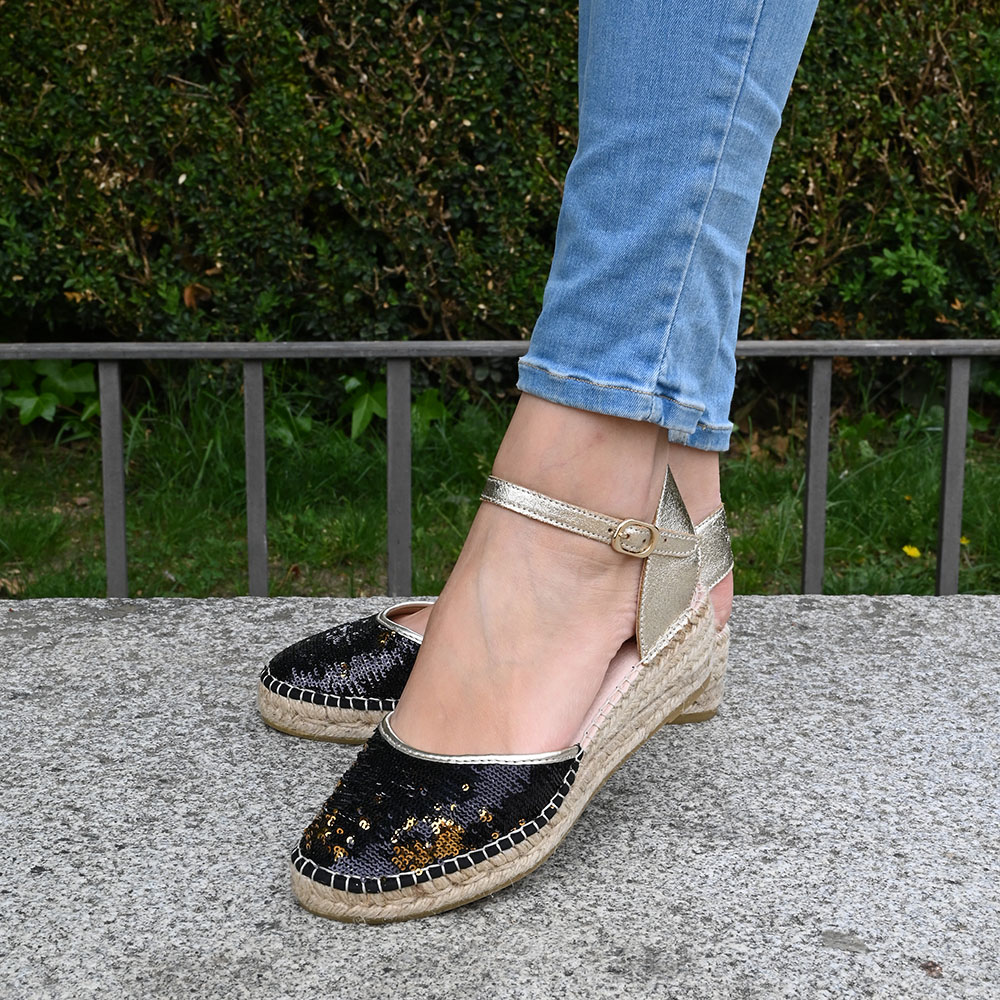 Su puntera está recubierta de lentejuelas que guardan un secreto: con un simple roce, pasan de color negro a un brillante cobre. Para equilibrar su fuerza, el talón y la pulsera de tobillo se visten de un suave oro metalizado, aportando esa luz cálida que estiliza la pierna y eleva cualquier look, de día o de noche.