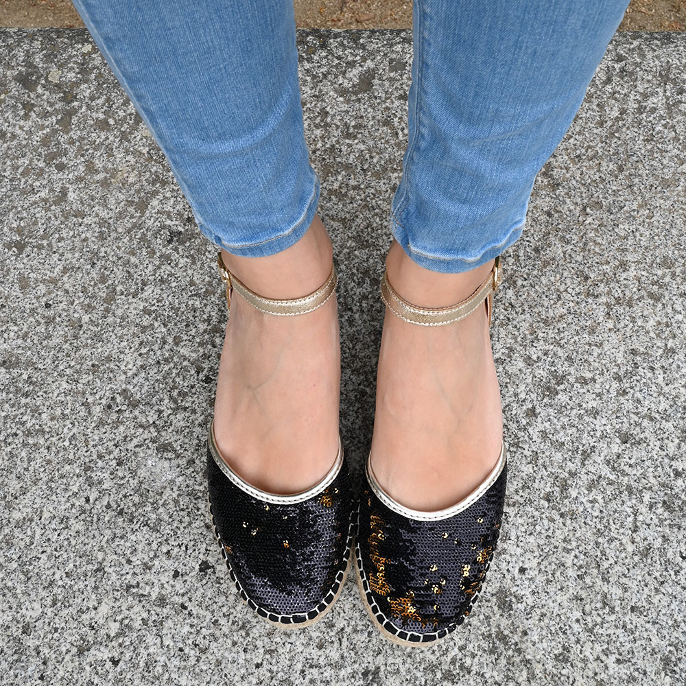 ✔︎ Zapato: Hechas a mano. Exterior en piel y tejido de lentejuelas cambiantes. Interior de tejido técnico.