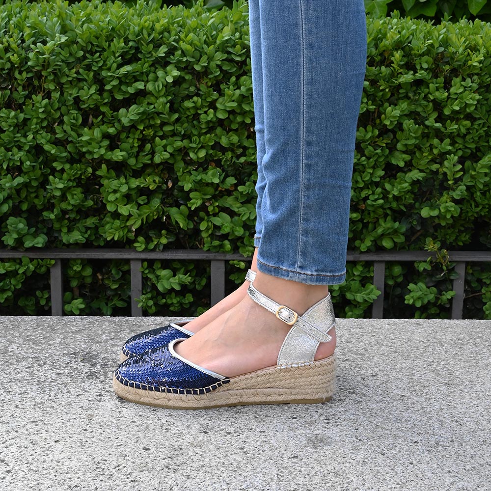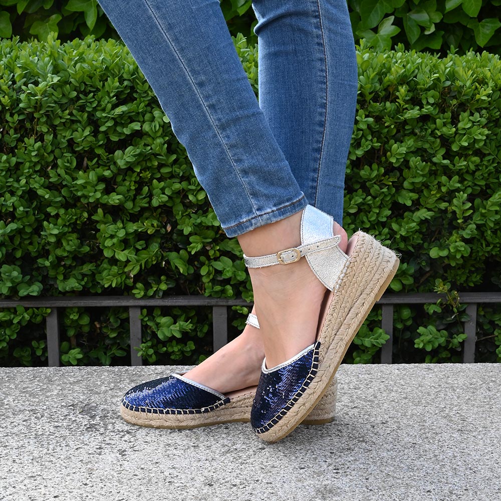 Su puntera está recubierta de lentejuelas que guardan un secreto: con un simple roce, pasan del azul profundo del océano nocturno a un plateado estelar, permitiéndote transformar tu look de la sobriedad a la luz en un instante. Contrastan con un talón en piel metalizada plata que recuerda a la espuma de las olas . No es solo un zapato; es el amuleto de quienes llevan el mar incluso lejos de la orilla.