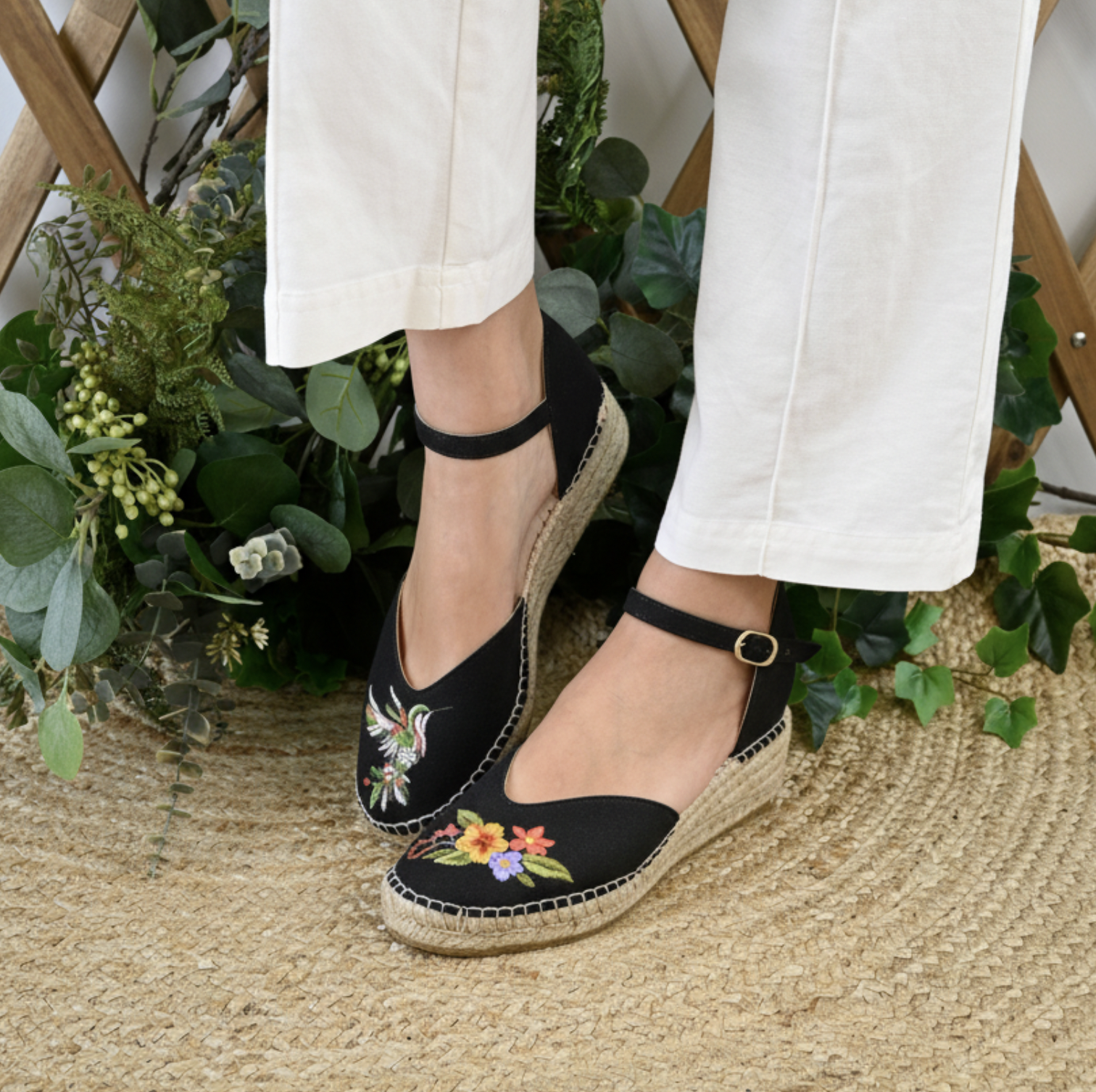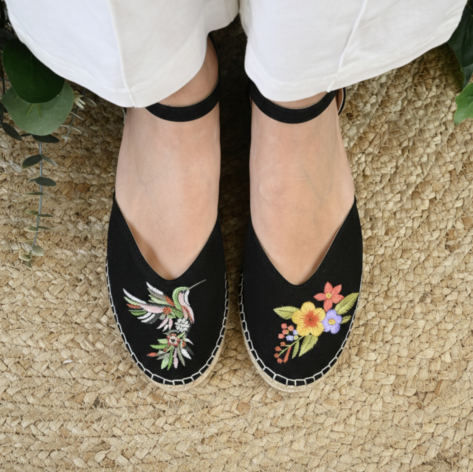 Imagina caminar con la esencia de un jardín a tus pies. Nuestras alpargatas Colibrí en color negro no son solo un accesorio, son una pequeña obra de arte que celebra la asimetría y la naturaleza.