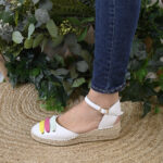 La alpargata Cordelia está inspirada en el nácar de los tesoros ocultos del océano. Su piel blanca de efecto rugoso y acabado perlado es un homenaje a la luz del mar. Un diseño que equilibra la naturalidad del yute con pinceladas de color que bailan en tu empeine; amarillo solar, fucsia coral y verde menta.