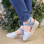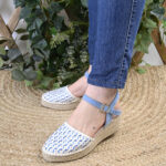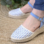 Su diseño destaca por una piel trenzada a mano y troquelada, donde el blanco puro se entrelaza con pinceladas de azul, recreando los matices de los riachuelos en plena naturaleza. La delicada tira de serraje a juego con las cintas de raso, abraza el tobillo con la suavidad de una caricia, proporcionando una sujeción segura, con hebilla y elástico, sin perder la ligereza que define a este nombre.