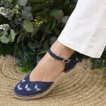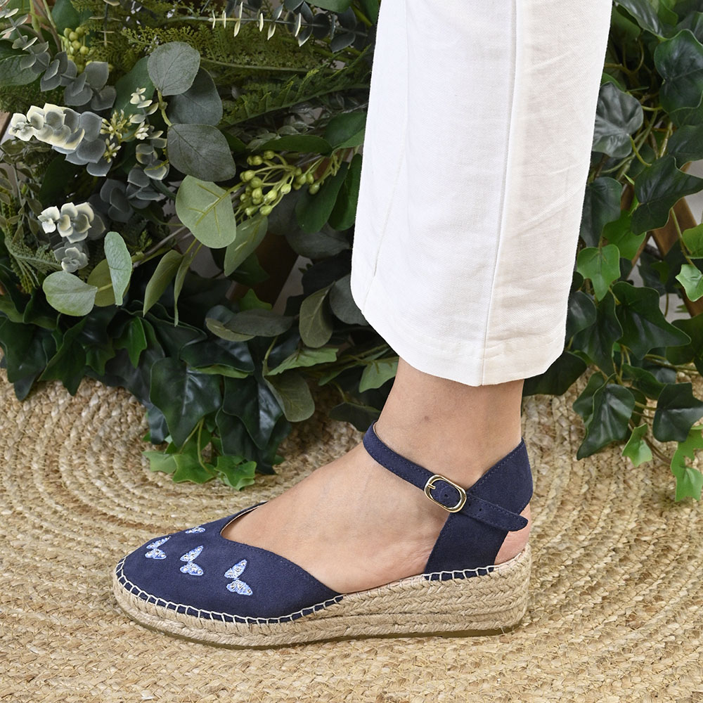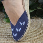 La alpargata mariposa está diseñada para las que buscan caminar con ligereza sin renunciar a la elegancia. Confeccionada en un suave y aterciopelado serraje en un profundo azul océano donde cinco mariposas bordadas, que parecen haber posado sus alas de cristal sobre la tela, aportan un destello sutil con cada movimiento.