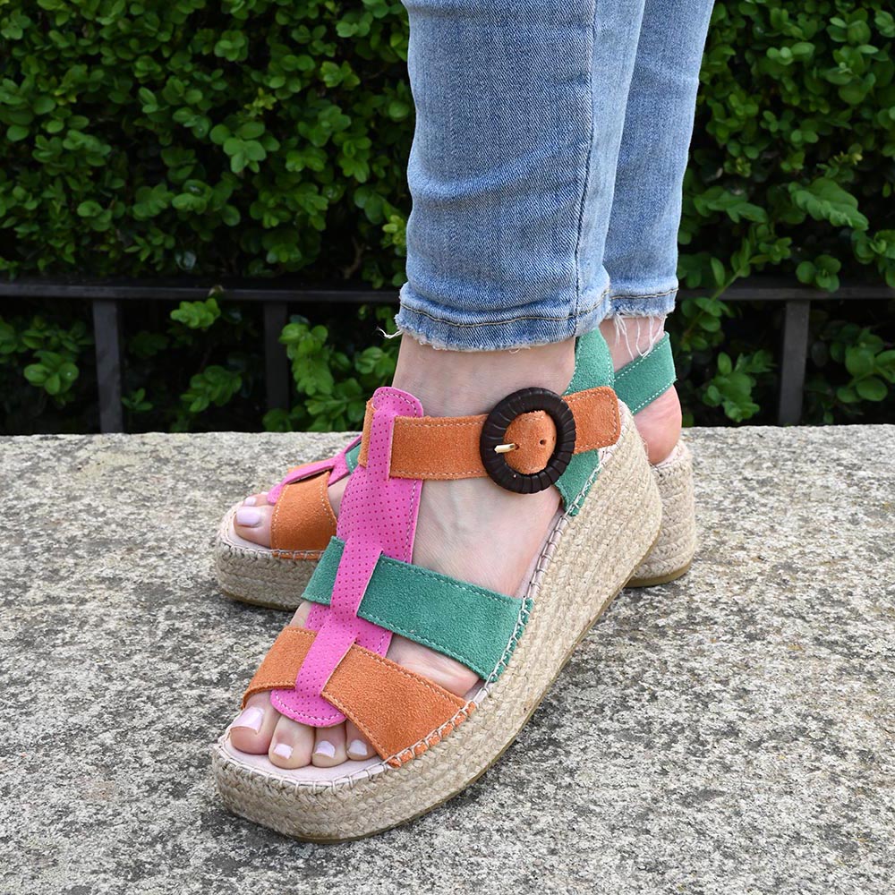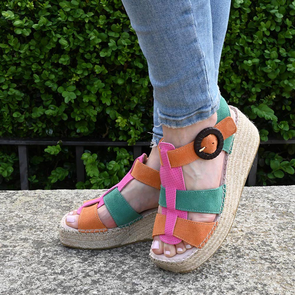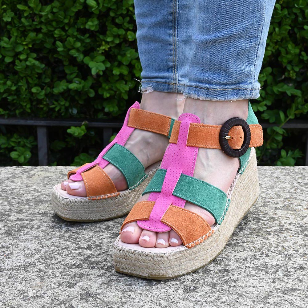 Su estructura de tiras entrelazadas en suave serraje combina naranja, verde y un rosa chicle que no pide permiso, sino que marca el paso. El detalle final lo pone su hebilla circular de aire retro, que abraza el tobillo con seguridad y un toque chic irresistible.