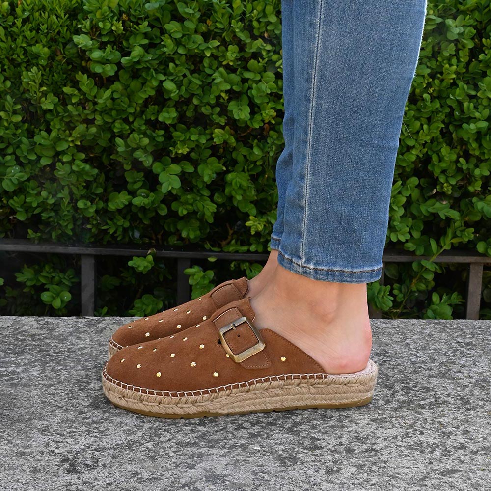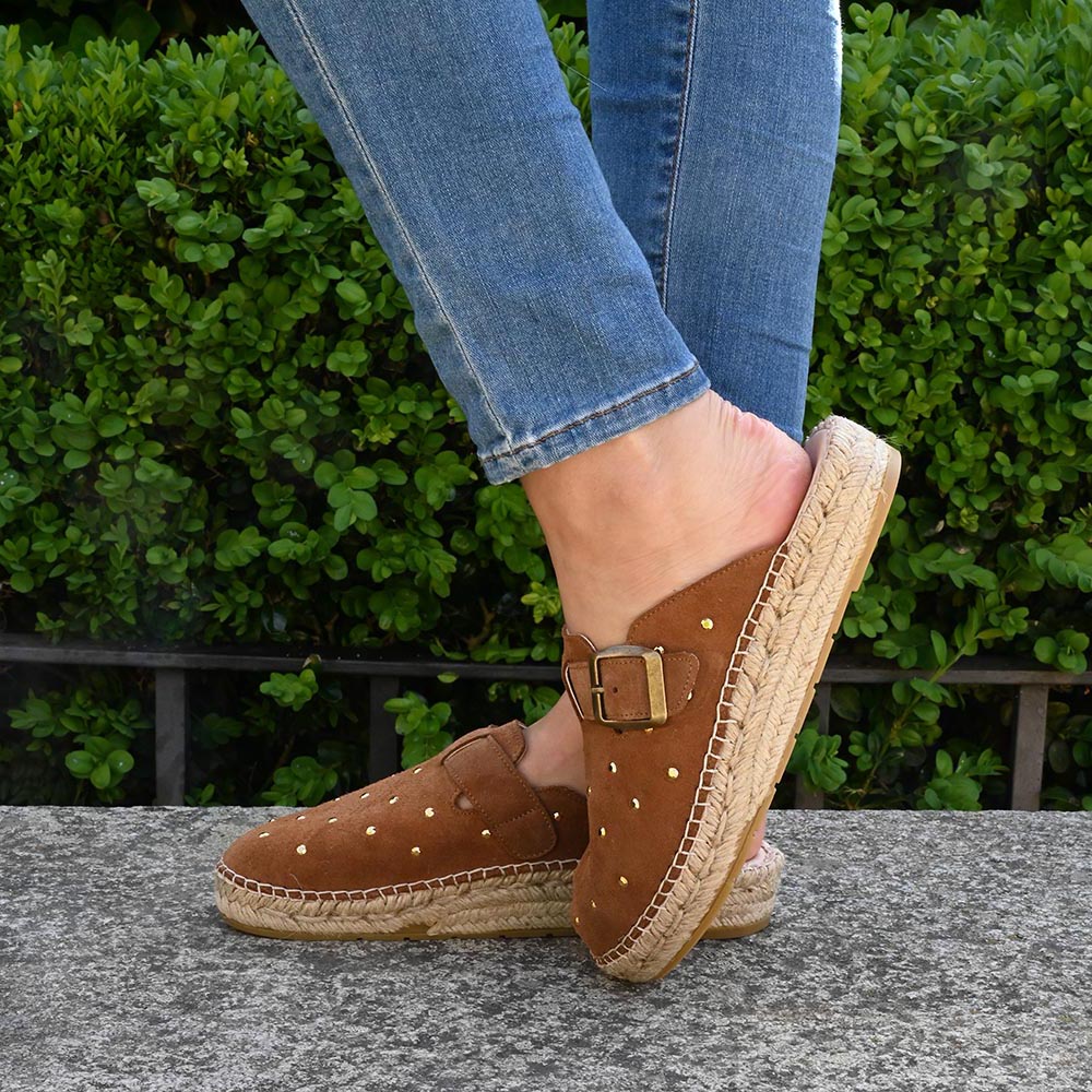 ✔︎ Zapato Artesanal: hecho a mano. Exterior de piel serraje con adorno de tachas. Interior de tejido técnico.