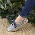 El broche final lo pone su cinta de falla en azul profundo, que abraza el empeine con la elegancia de un lazo de alta costura, permitiendo que la comodidad de una alpargata se transforme en la sofisticación de un zapato de noche.