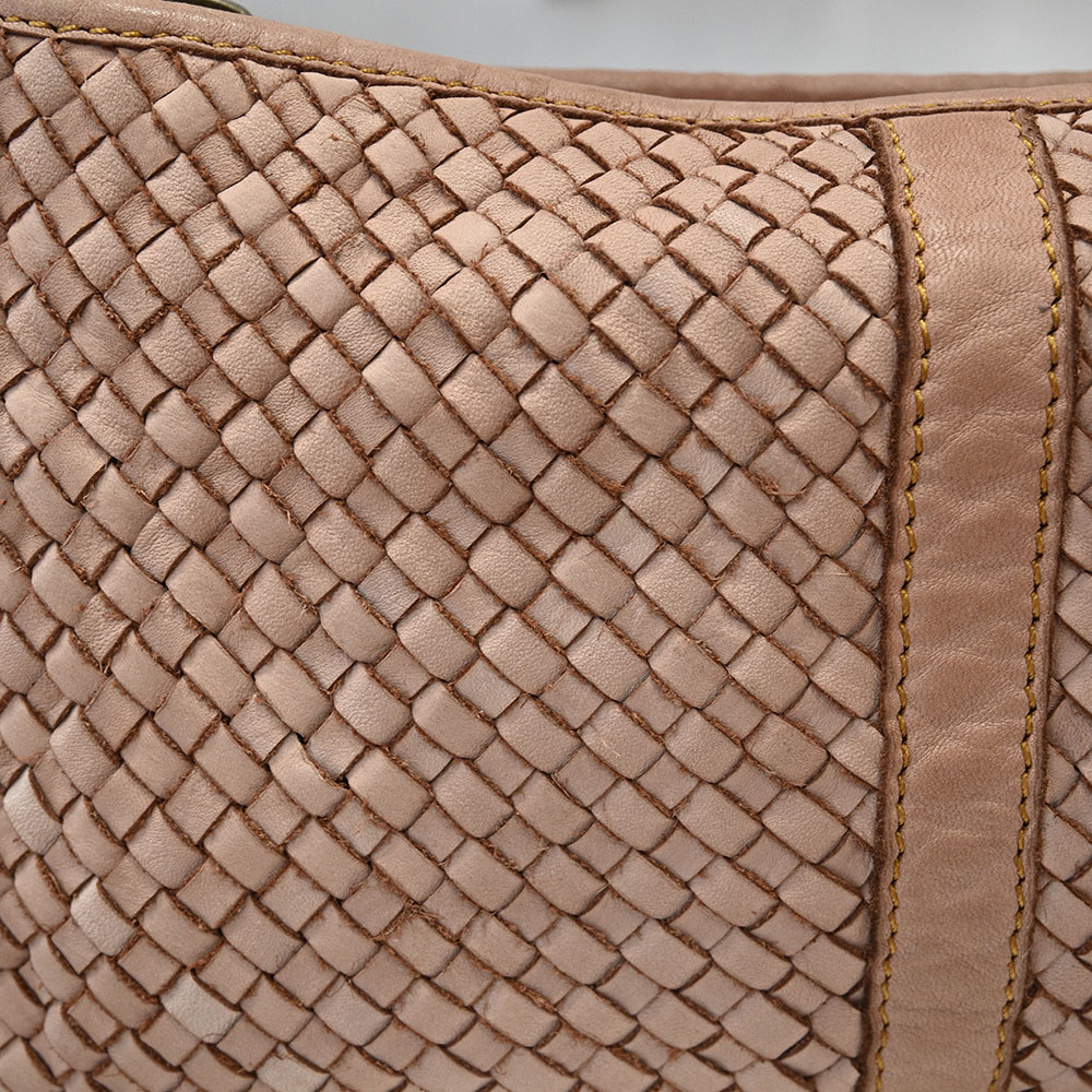 Su forma ergonómica de hobo lo hace cómodo de llevar al hombro o cruzado. Incluye una correa de hombro ajustable y un asa superior, ambas en piel al tono.