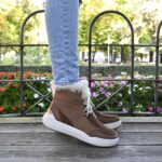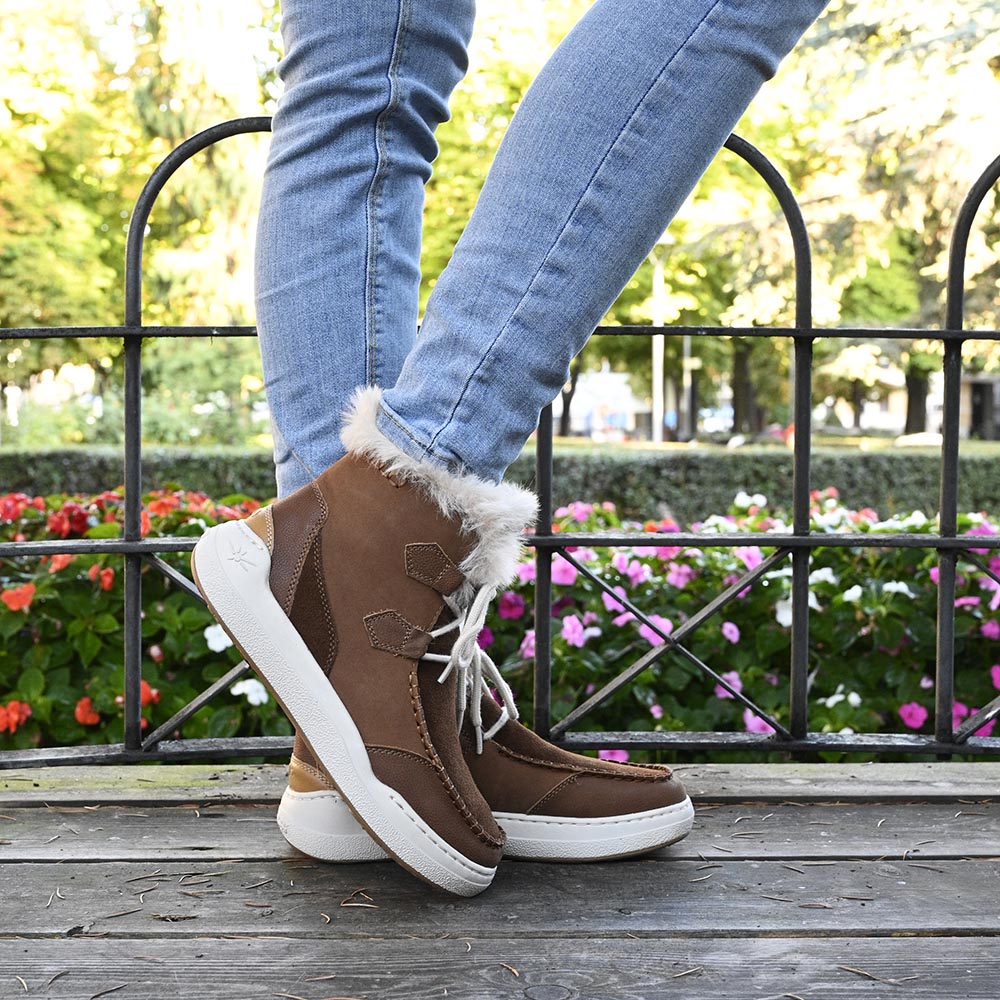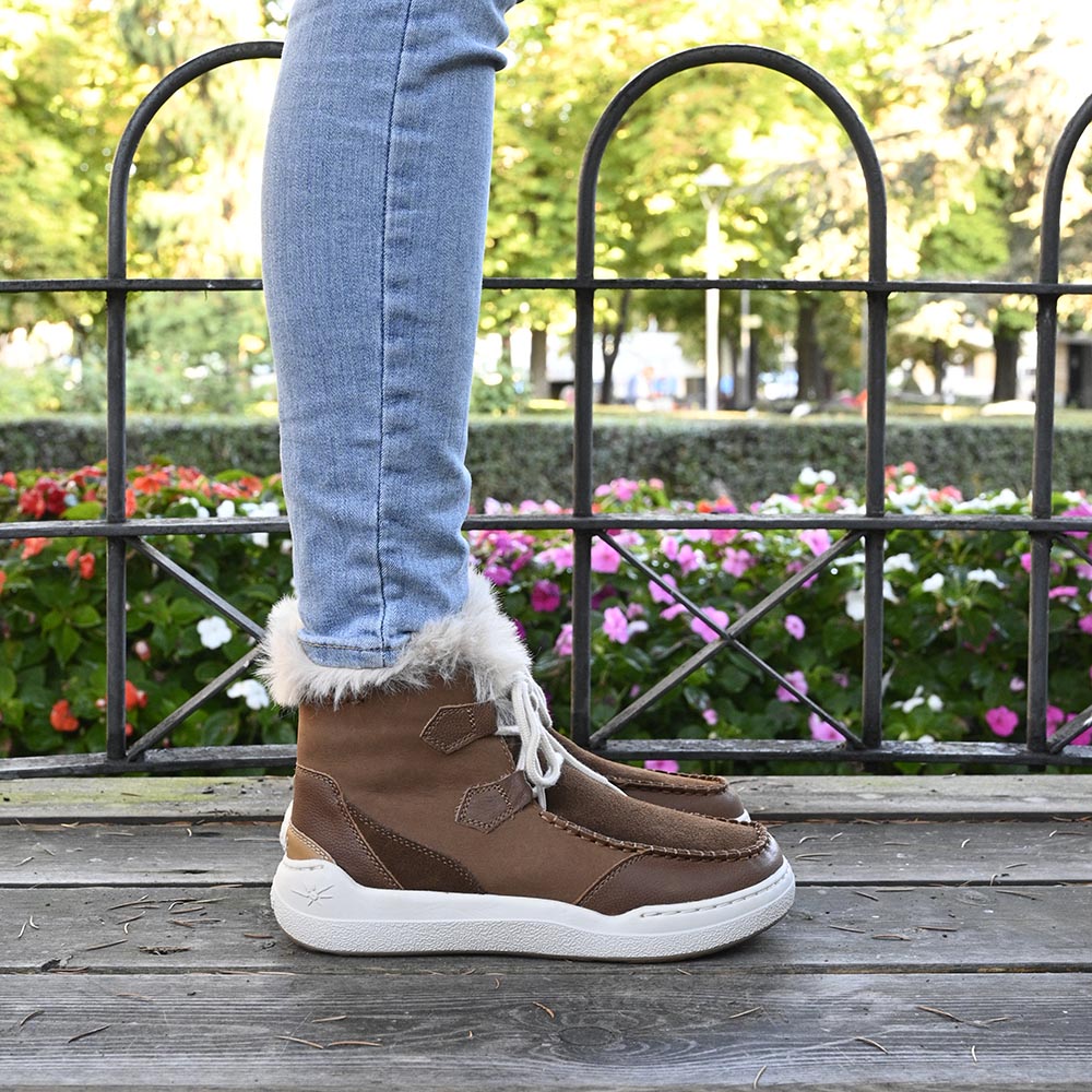 Además su combinación es pura genialidad; combina serraje y piel en tono camel con detalles en cuero. Cordonera ajustable y un suave pelito beige en el interior de la caña.