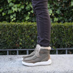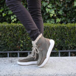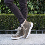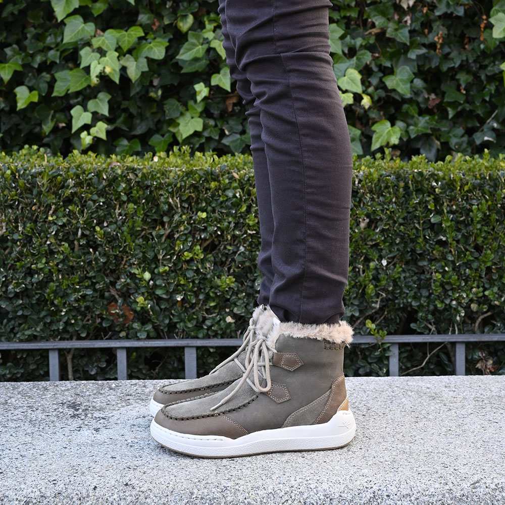 Además su combinación es pura genialidad; combina serraje y piel en tono taupe con detalles en cuero. Cordonera ajustable y un suave pelito beige en el interior de la caña.