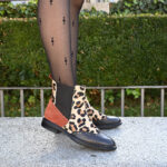 Esta confeccionado con una espectacular piel de pelo de potro con estampado de leopardo jugando en tonos con la puntera redondeada, vestida con una suave piel napa color chocolate que luce un adorno en vega y se desliza sobre el diseño con aires de oxford.