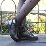 Completa tus outfits de faldas, vestidos o pantalones con este botín en piel verde con acabado metalizado y rugoso. Además cuenta con detalles en piel negra adornados con pequeñas tachuelas en la talonera.