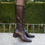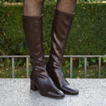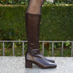 Esta confeccionado con materiales elásticos de alta calidad con efecto napa marrón café, para que se ajusten a la perfección a tu pie. Su silueta femenina y estilizada se adapta al contorno de la pierna hasta acabar ligeramente en una punta redondeada. Lleva un cómodo tacón de 5cm forrado en el mismo material, perfecto para usar diariamente con infinidad de outfits.