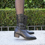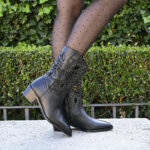 Confeccionada en piel negra, con adorno de pequeñas tachas redondeadas y planas en tono champan bordeando el original dibujo troquelado de su caña. Cuenta con una cremallera lateral para facilitar el calce, y un comodisimo tacón de 4 cm.