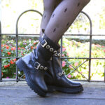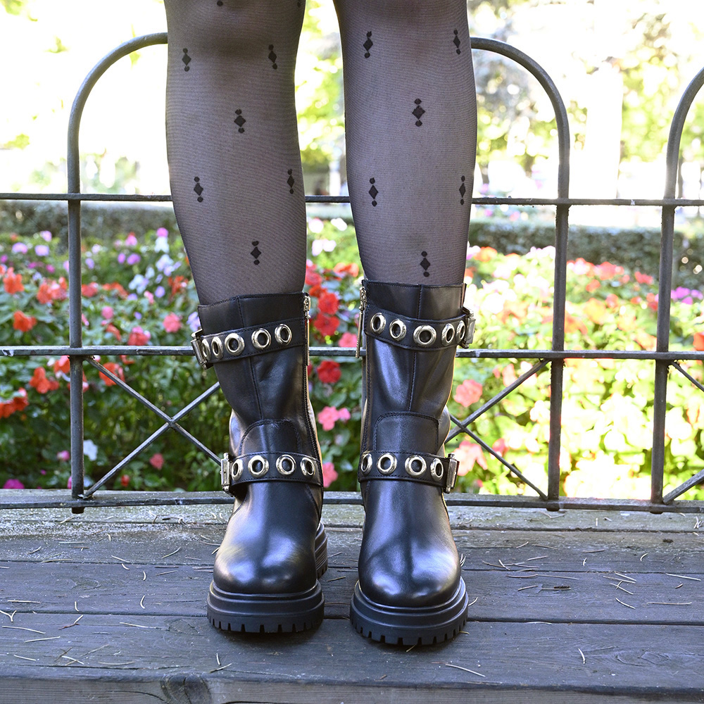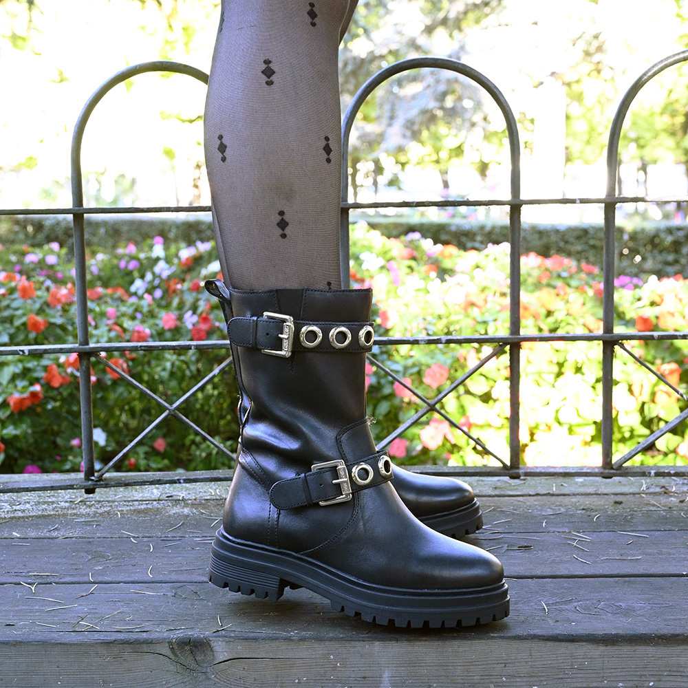 Estas botas de piel estilo biker son pura tendencia urbana. Confeccionada en una suave piel negra, está adornada con hebillas olladas con piezas metálicas champan.