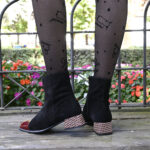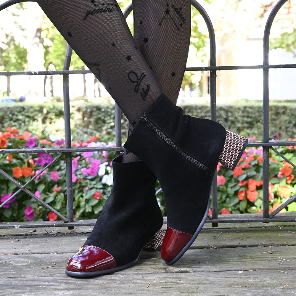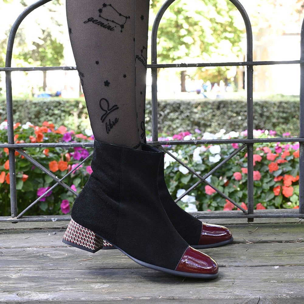 Danila está confeccionado en un suave y gustoso serraje negro tratado con tecnología «hydrovelour». Luce una puntera redondeada en charol burdeos junto con un guiño de color muy original en el tacón, forrado con una piel impresa con motivo geométrico en tonos burdeos, marrones y beige.