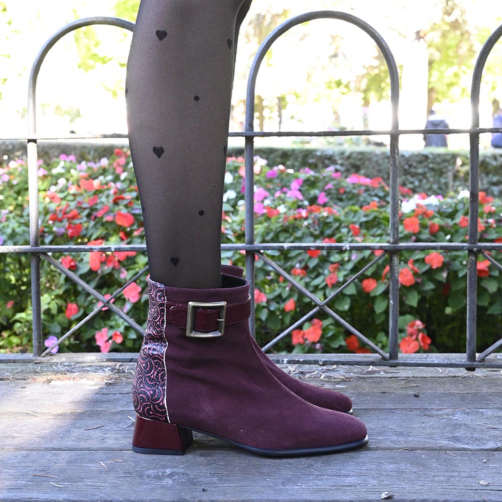 Esta diseñado en una suave piel serraje burdeos que se adapta como un guante. De lineas sencillas y clásicas, rompe con piel estampada de motivos ondulantes negros y rojizos en la talonera. Un toque original y con mucha personalidad que lo transforma por completo. Cuenta además con una tira al tobillo en charol burdeos, ligeramente regulable, con adorno de hebilla cuadrada bronce y acabado envejecido.