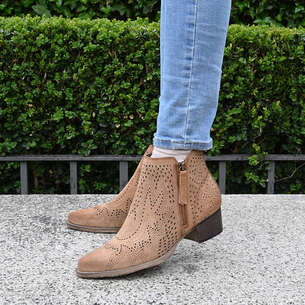 Elaborado en un serraje color toffee de textura aterciopelada, Jenny te envuelve en una sensación de confort inmediato. Pero su verdadero corazón reside en su intrincado troquelado que evoca la artesanía tradicional, dándole un carácter único y texturizado.