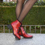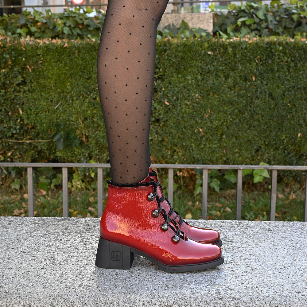 Está confeccionado con una increíble y blanda piel charol roja con efecto rugoso que es toda una sensación.  En lugar de la clásica cordonera, luce cierre con divertidos botones  redondeados y elástico en negro. Y para darle un toque aun más original y coqueto, está ribeteado con una puntilla fruncida de terciopelo negro.  Consiguiendo un resultado femenino y risueño.