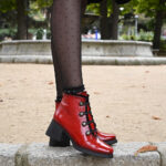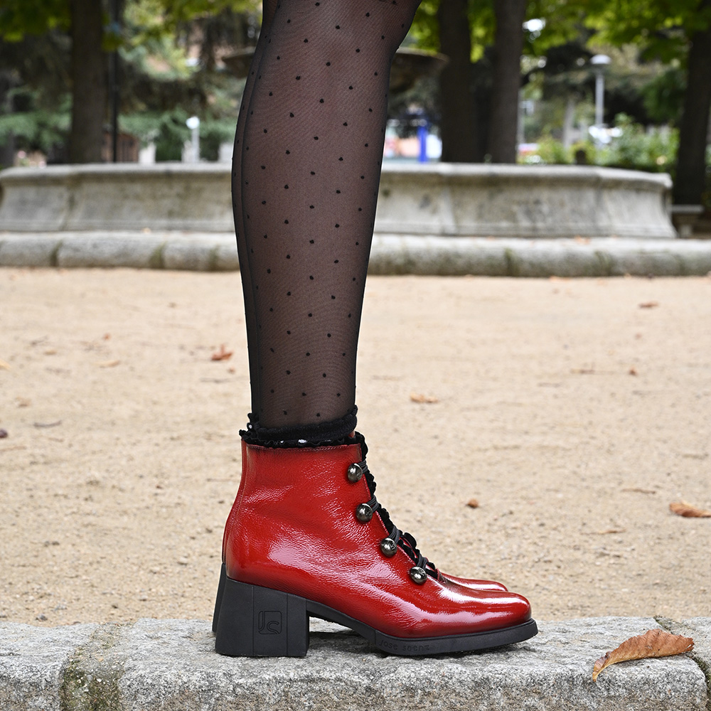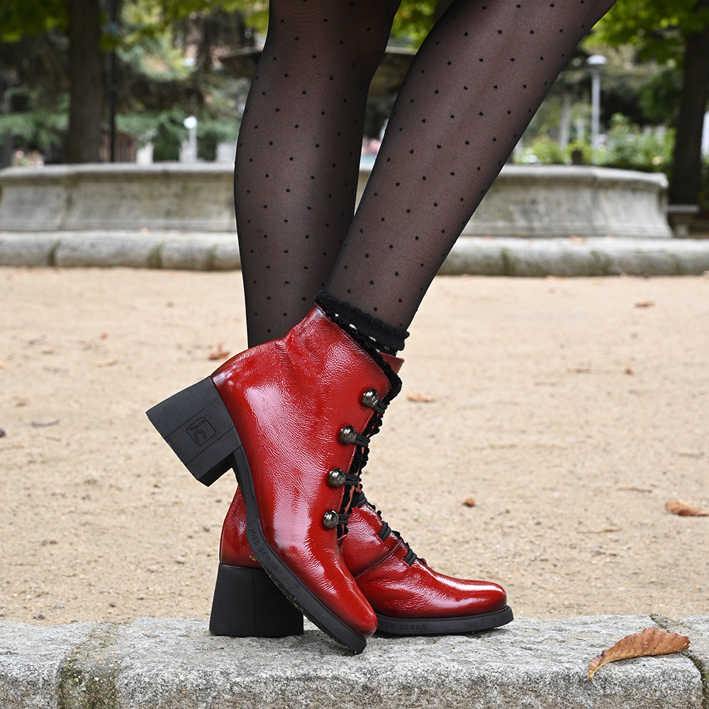 Está confeccionado con una increíble y blanda piel charol roja con efecto rugoso que es toda una sensación. En lugar de la clásica cordonera, luce cierre con divertidos botones redondeados y elástico en negro. Y para darle un toque aun más original y coqueto, está ribeteado con una puntilla fruncida de terciopelo negro. Consiguiendo un resultado femenino y risueño.