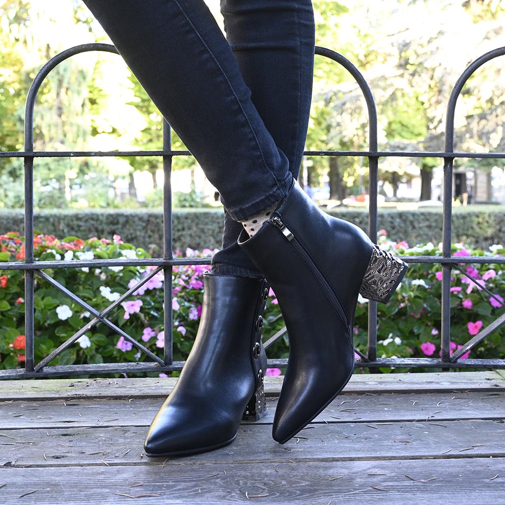 Eleva tu estilo con estos botines negros en suave tejido efecto napa con adornos en color pewter, diseñados para aportar un toque de distinción a tus looks. El negro intenso combina con todo, mientras que los detalles pewter añaden un aire moderno y elegante que no pasará desapercibido.