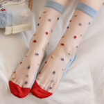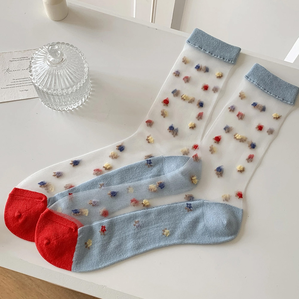 Estos adorables calcetines medias destacan por su diseño transparente decorado con pequeñas flores multicolores bordadas que aportan frescura y alegría a cualquier look.