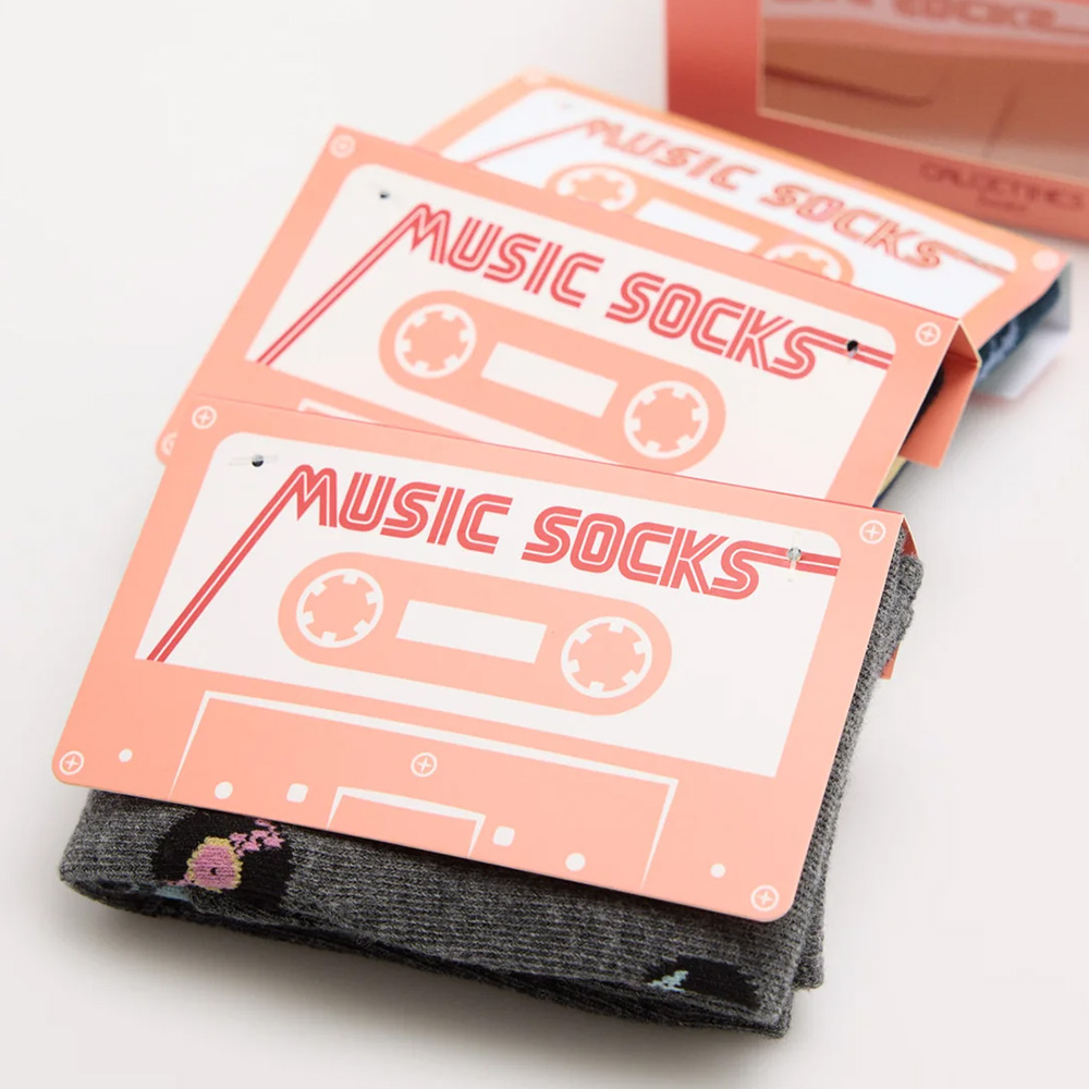 - Presentación especial: caja decorativa con diseño de cassette y el mensaje “Music Socks”, ideal como regalo.