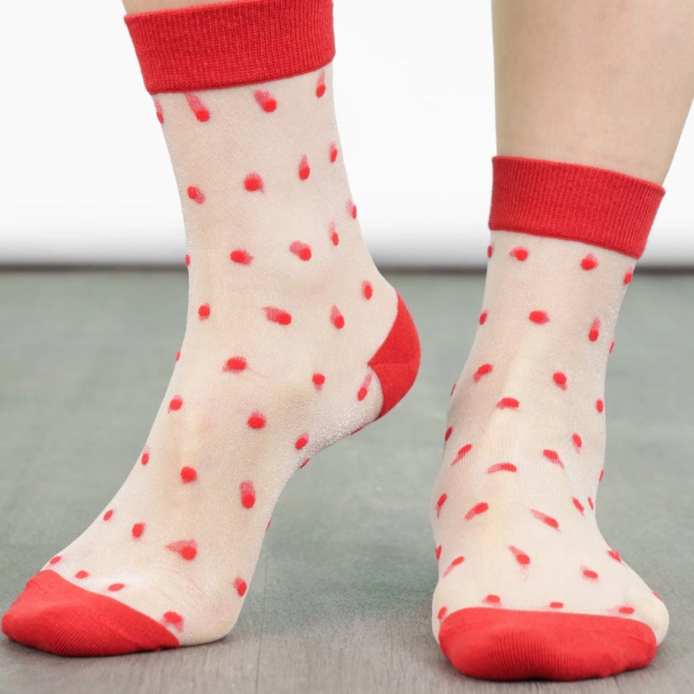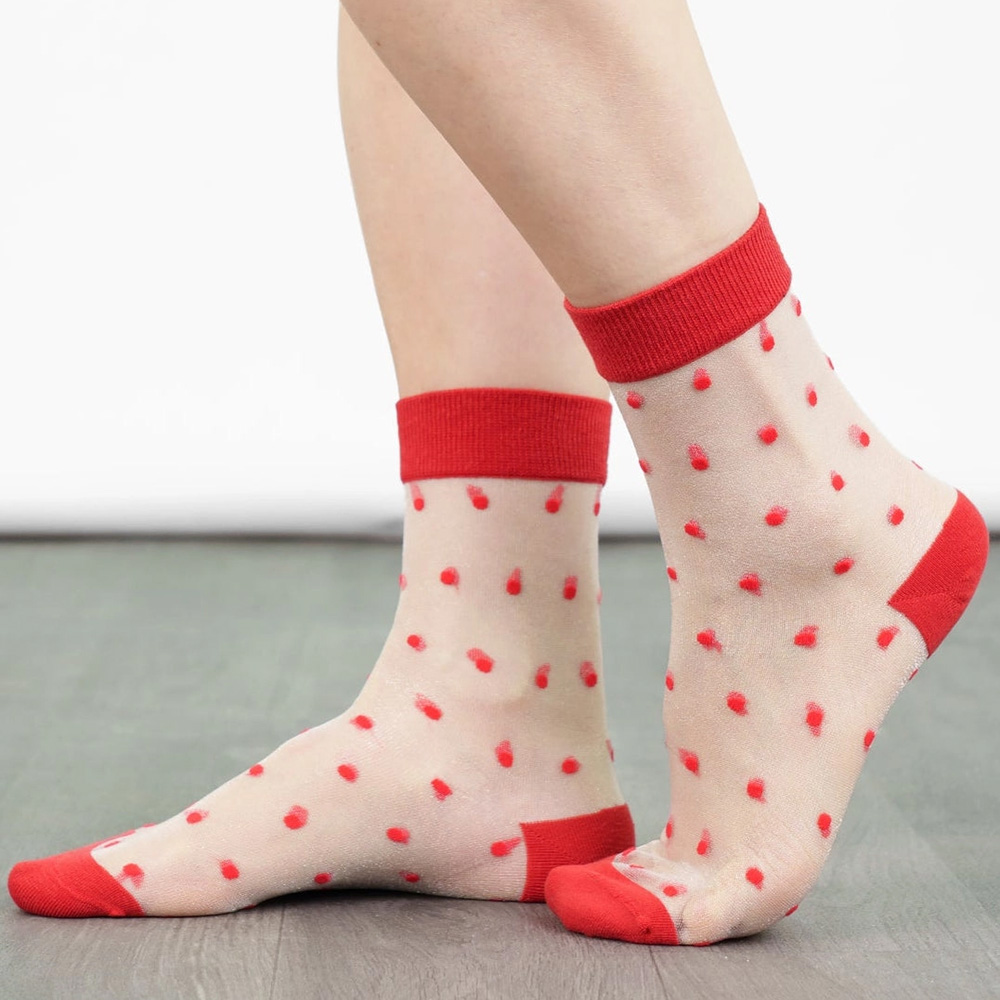 Estos originales calcetines transparentes con plumeti rojo son ideales para llevar tanto con deportivas como con botines y zapatos. Aporta un toque de fantasía a tus pies y déjate seducir por su glamuroso encanto.