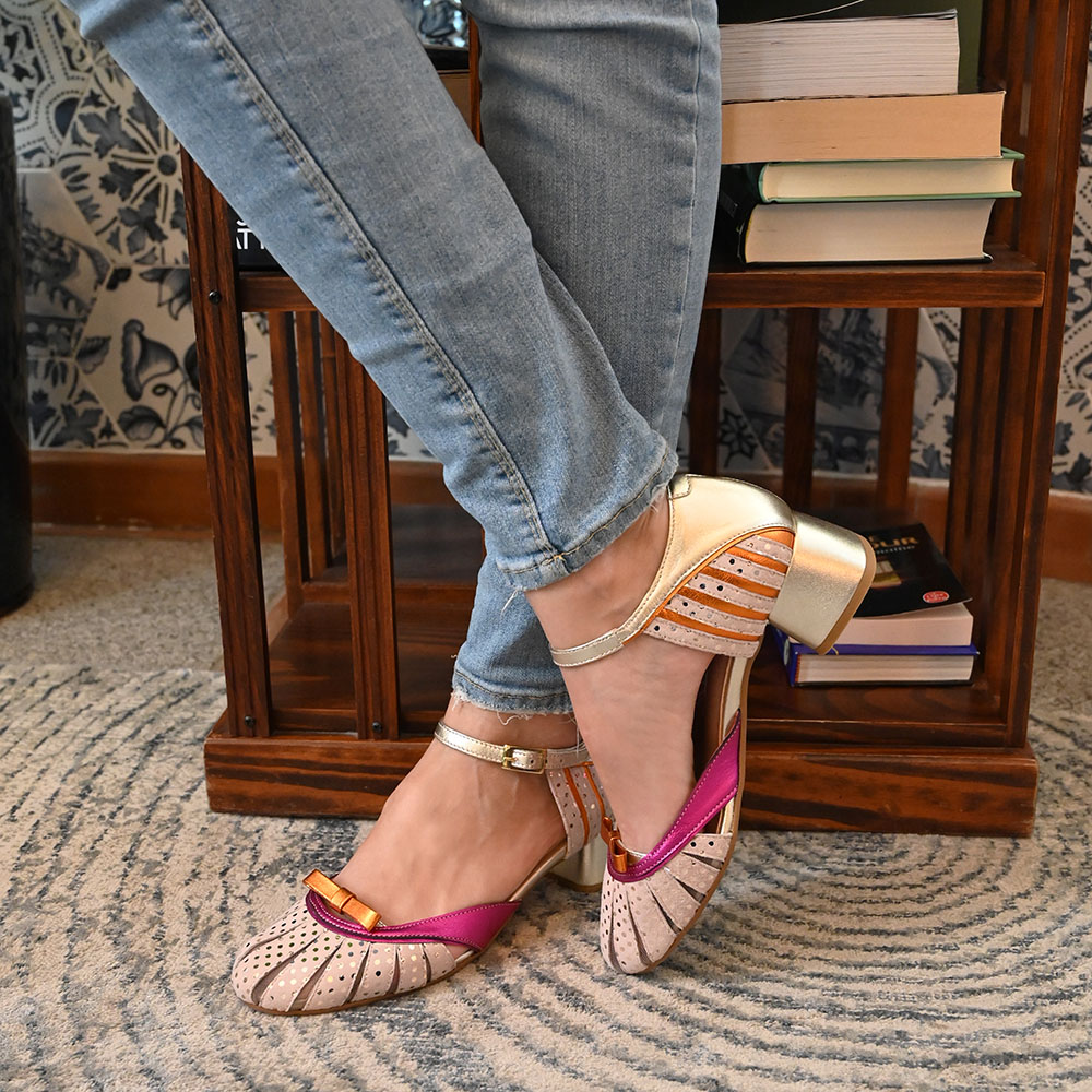 La estructura principal se presenta en un tono champán metalizado, sobrio y elegante, que envuelve el talón y la pulsera del tobillo. Sin embargo, el verdadero alma del diseño reside en su juego cromático; piel ante en rosa maquillaje impresa con puntos en tono champan, rompe con una franja de un vibrante  fucsia metalizado en el empeine, aportando una energía casi eléctrica. Por otro lado, el metalizado naranja resurge con un pequeño lazo en el escote, y chispeantes tiras en la talonera.