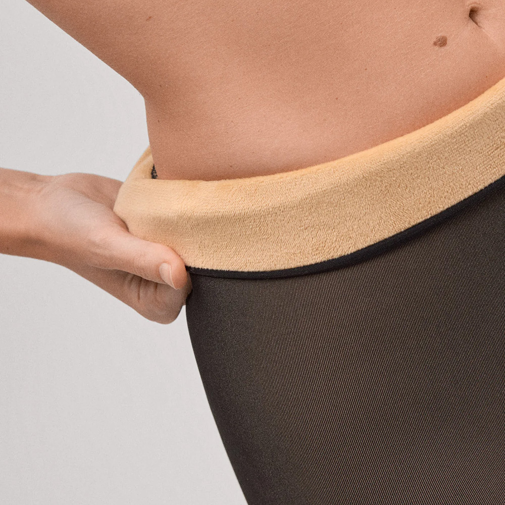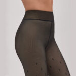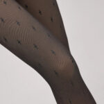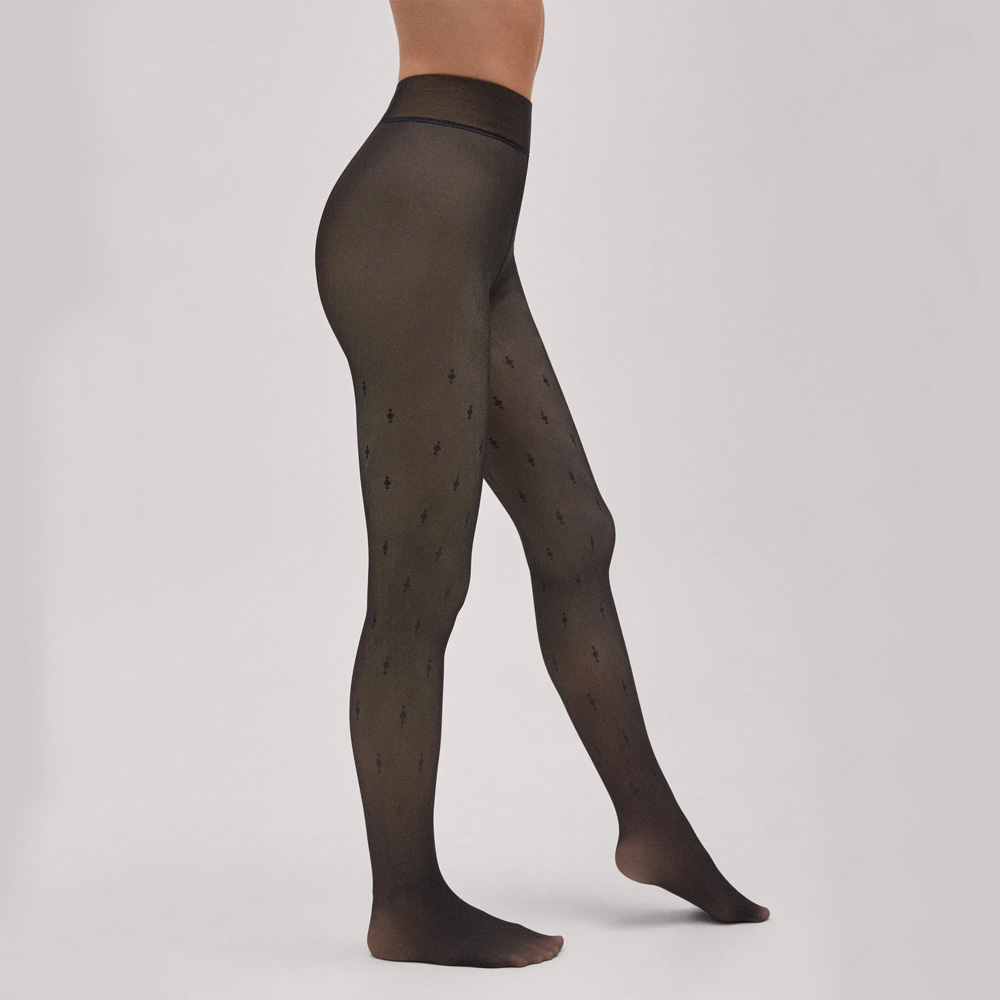 Panty térmico transparente 160 deniers con efecto velado, interior afelpado. Este modelo tiene un estampado geométrico con rombos y pequeñas esferas.
