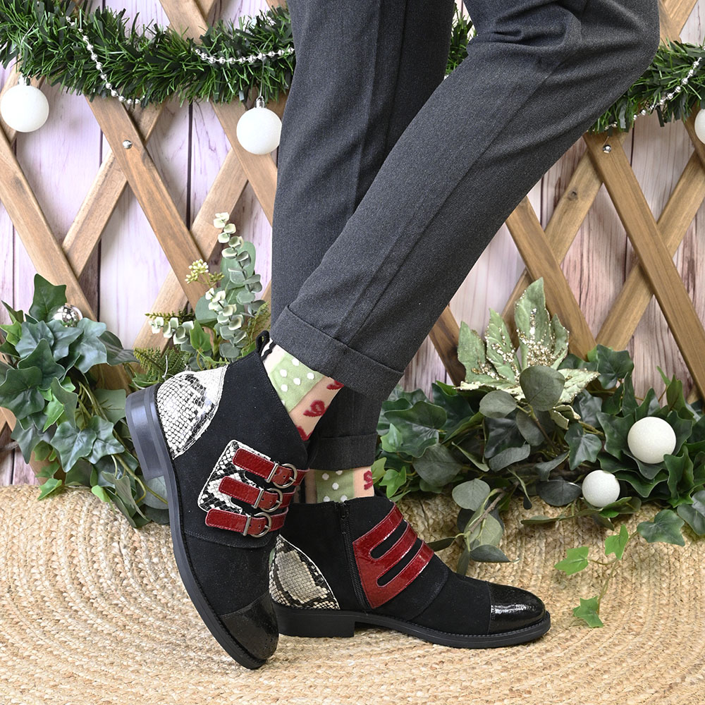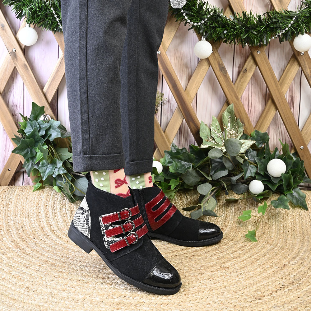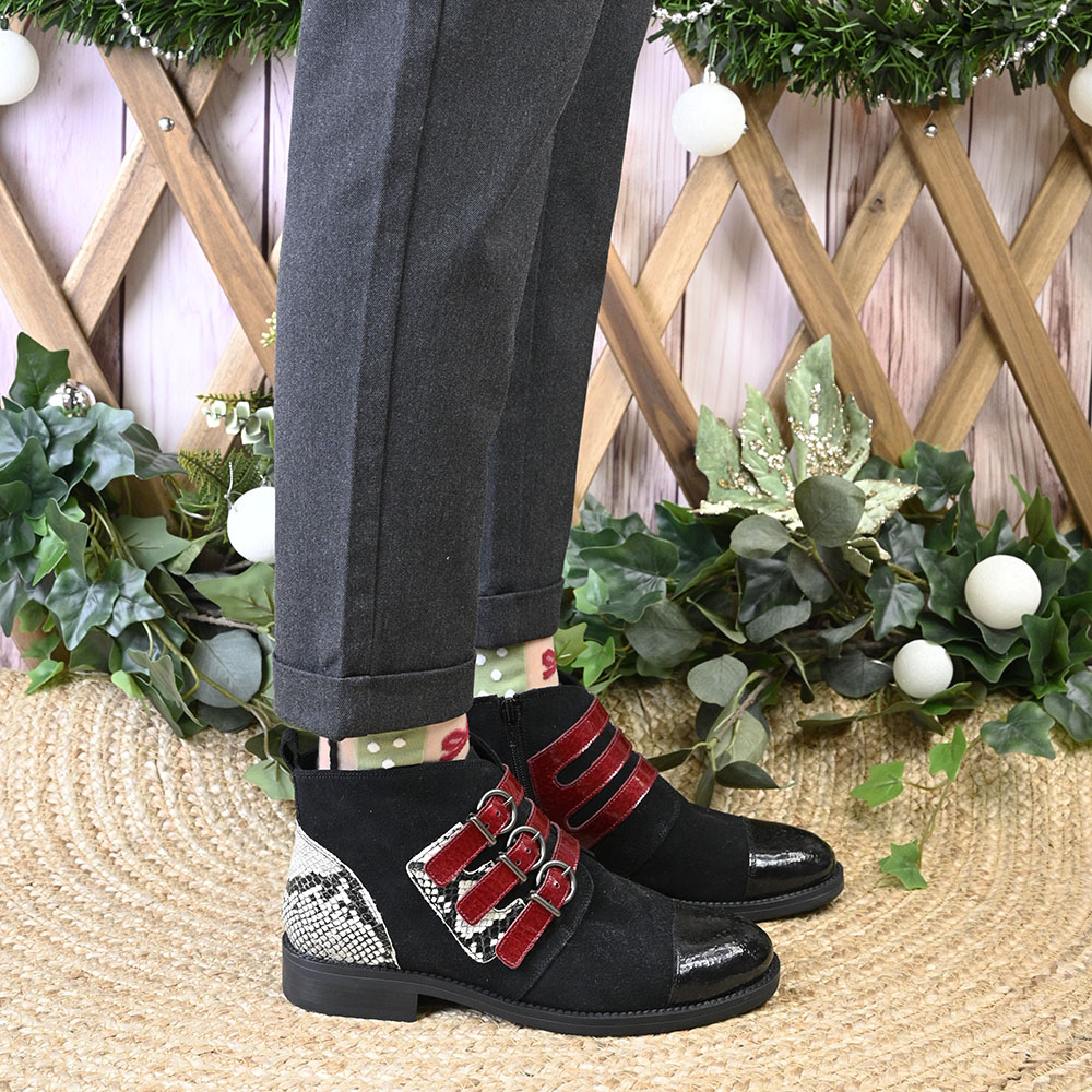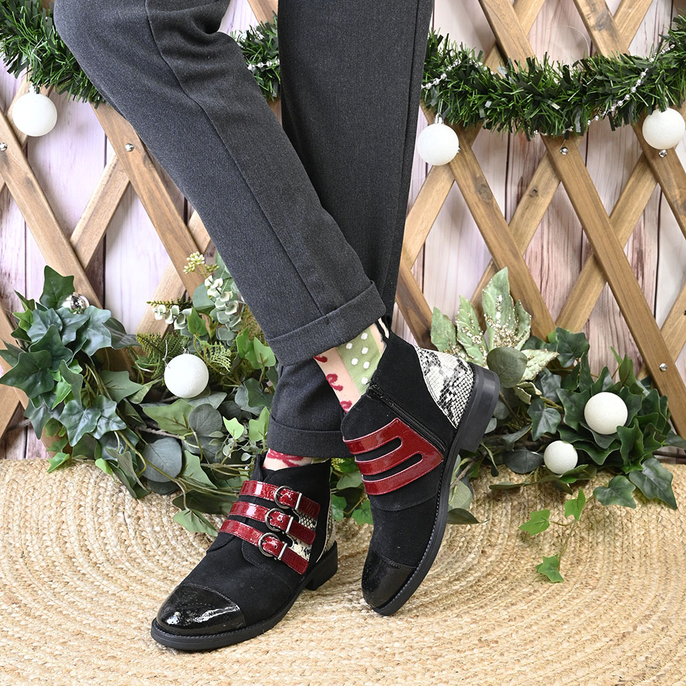 El contraste protagonista del diseño se lo proporciona la piel con estampado serpiente en gama de negros, grises y blancos con relieve y las tres tiras en charol burdeos que ajustan sobre el empeine con cierre de hebilla.