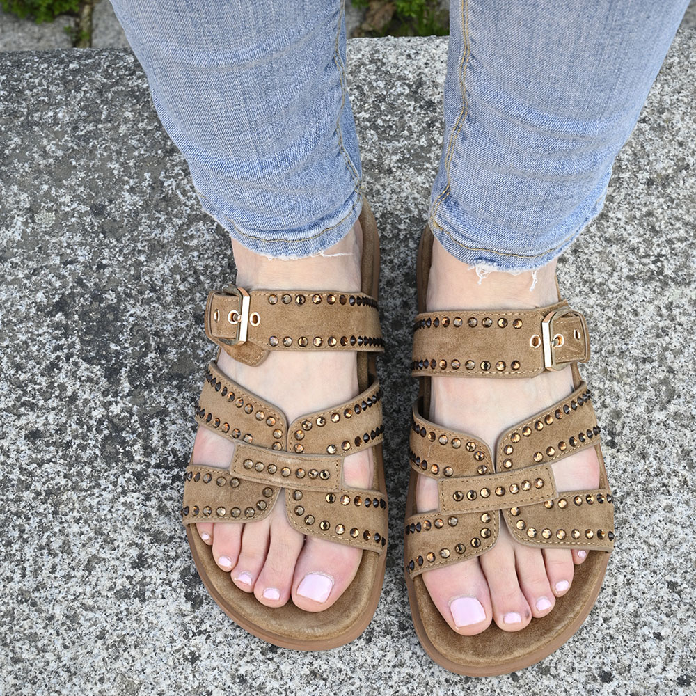 Cobran especial protagonismo las filas de cristales en color ámbar, que no son solo un adorno; son pequeños puntos de luz que capturan el sol con cada paso, dándole un aire rebelde y chic a tu estilo.