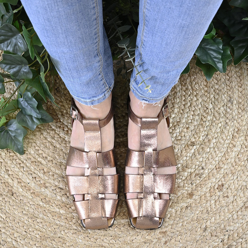 Lo primero que notas es su piel metalizada con efecto craquelado. No es un brillo liso y aburrido; tiene textura, tiene historia y tiene ese tono cobre que funciona como un neutro pero con muchísima más clase. Es el tipo de material que gana personalidad con cada uso. Y junto a las tiras anchas y la puntera cuadrada, consigue ese aire casi escultural.