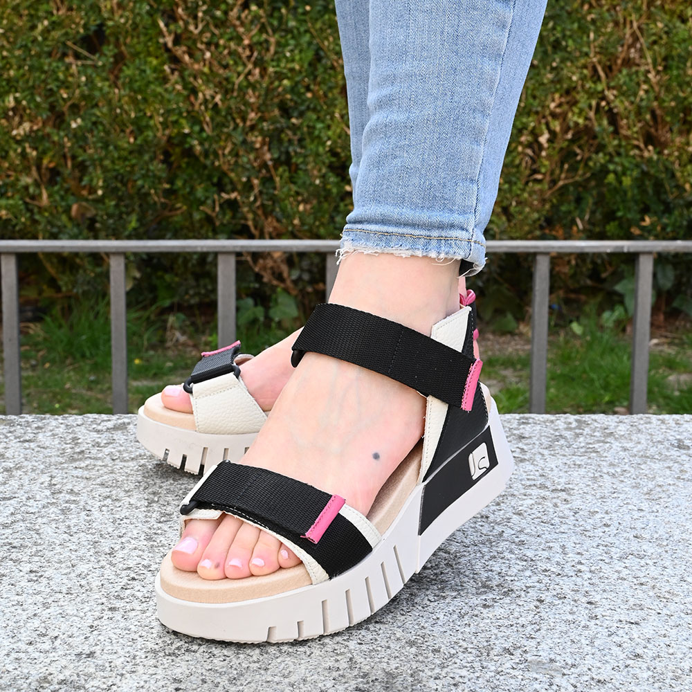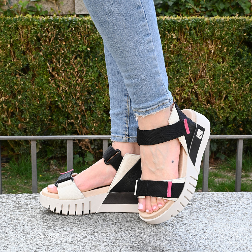 La sandalia Cusco es una obra de arte en piel con efecto rugoso de dos tonos. La base en un cremoso color beige combinada con negro aporta modernismo y versatilidad, mientras que el contraste en los detalles con toques fucsia crea una sensación fresca y dinámica. Las correas ajustables con velcro te permiten adaptarla perfectamente a tu pie, garantizando un ajuste seguro y personalizado. Su diseño de dos bandas con talón libre evoca la libertad de los días soleados.