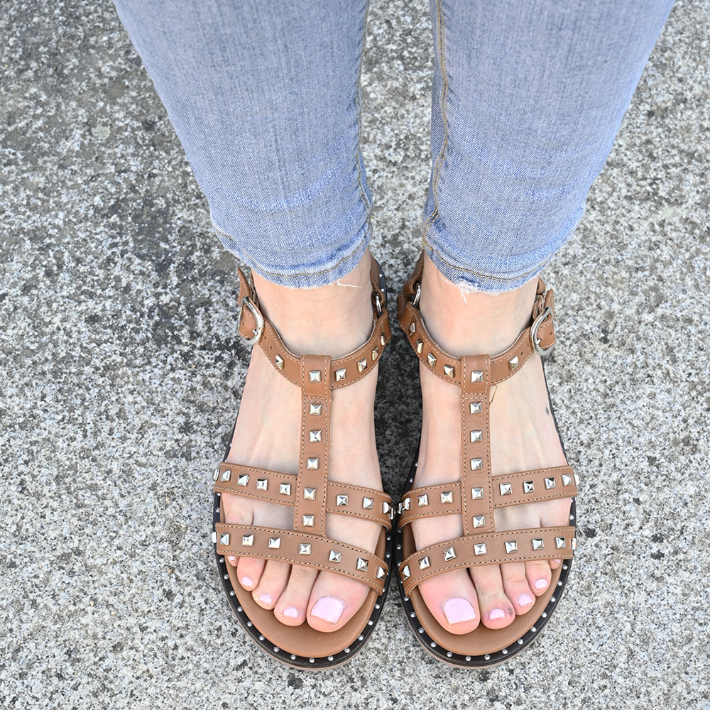 Gaia nace del deseo de fusionar la comodidad absoluta con una estética neo-romana. Su tono tan (tierra tostada) en piel premium de alta calidad evoca los paisajes mediterráneos , mientras que los remaches metálicos de forma piramidal añaden una textura moderna y sofisticada. Es la compañera ideal para quienes caminan con paso firme, desde una mañana de gestiones en la ciudad hasta un atardecer frente al mar.