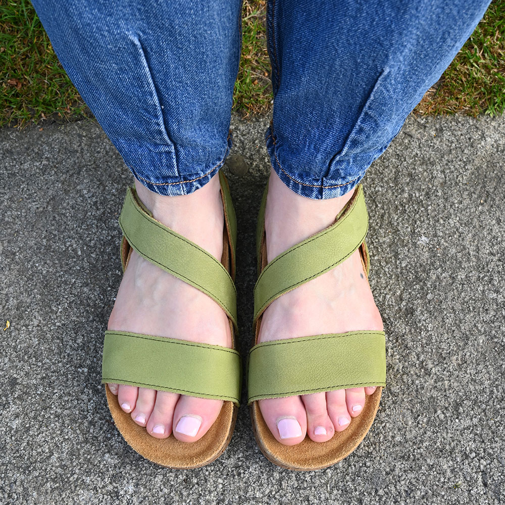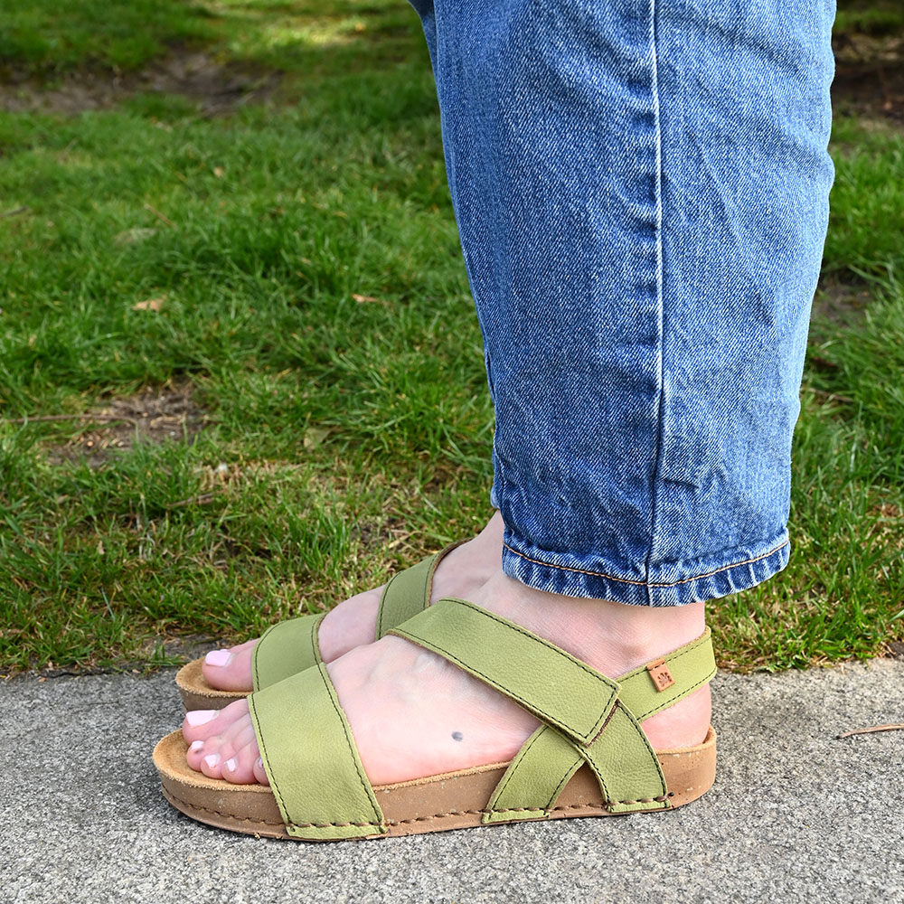 Confeccionada en piel bovina de primera calidad, su textura granulada en tono verde ofrece esa calidez orgánica que solo los materiales nobles pueden brindar. El diseño de tiras cruzadas abraza el pie con firmeza pero con suavidad, culminando en un práctico cierre de velcro que permite un ajuste milimétrico y veloz, perfecto para quienes no quieren perder ni un segundo.