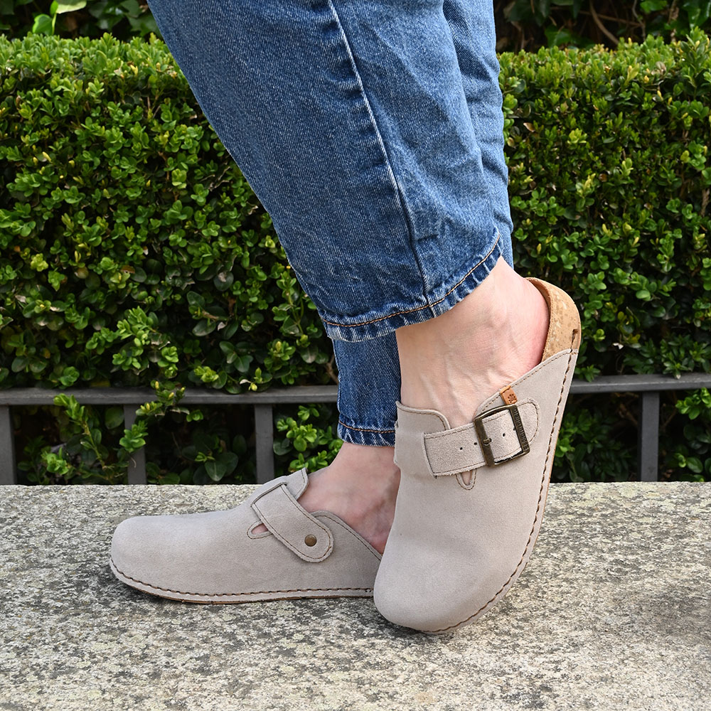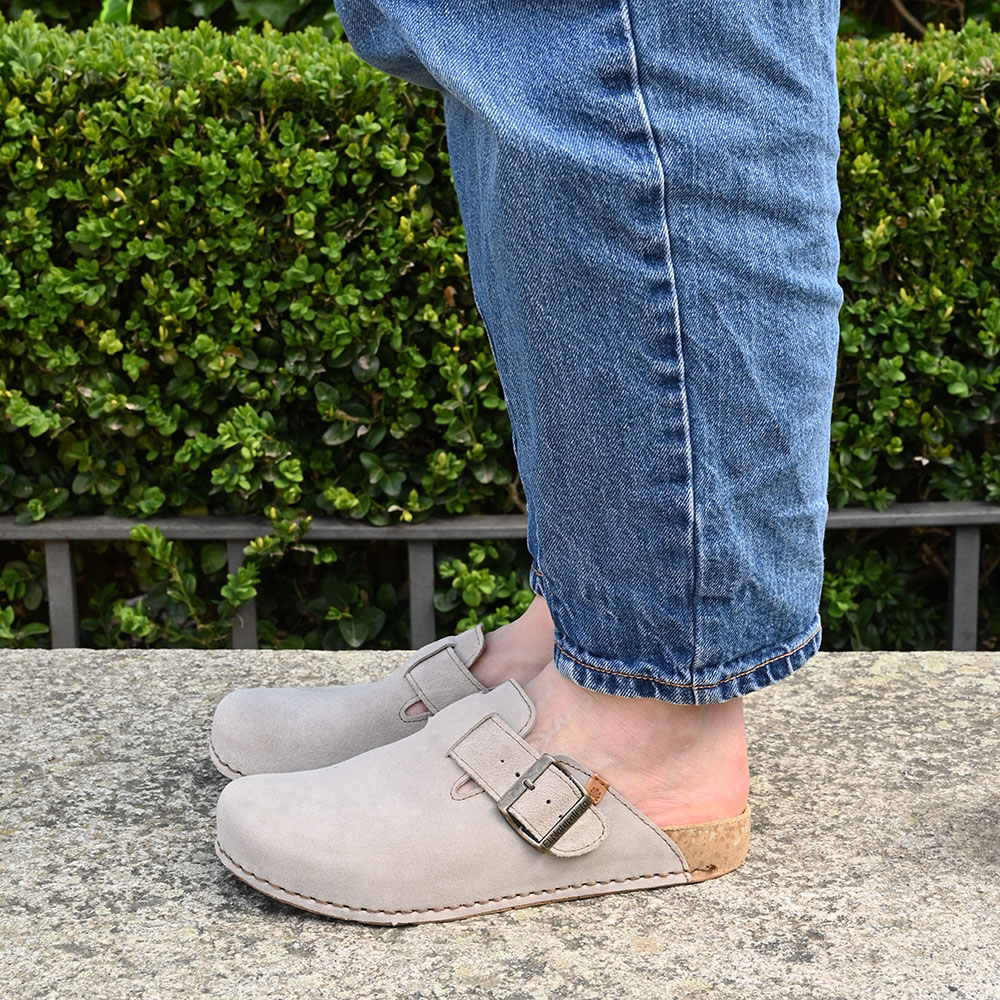 Fabricado en piel bovina en tono taupe, este zueco ofrece una textura aterciopelada que invita al tacto. La piel es suave desde el primer día, adaptándose a la forma de tu pie como una segunda piel, sin perder la estructura que caracteriza a un zueco de calidad. El diseño de puntera redonda y cerrada proporciona protección y calidez, ideal para los días más frescos o para quienes prefieren una sensación de mayor sujeción.