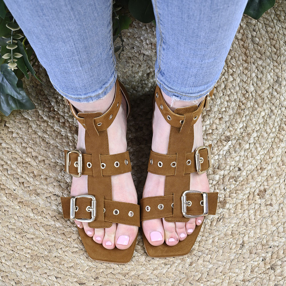 Confeccionada en ante de tono cuero que acaricia la piel, su diseño se define por la rotundidad de sus tres hebillas doradas. No son simples cierres; son destellos de luz que estructuran el pie, aportando un aire de «armadura urbana» sofisticada y segura.