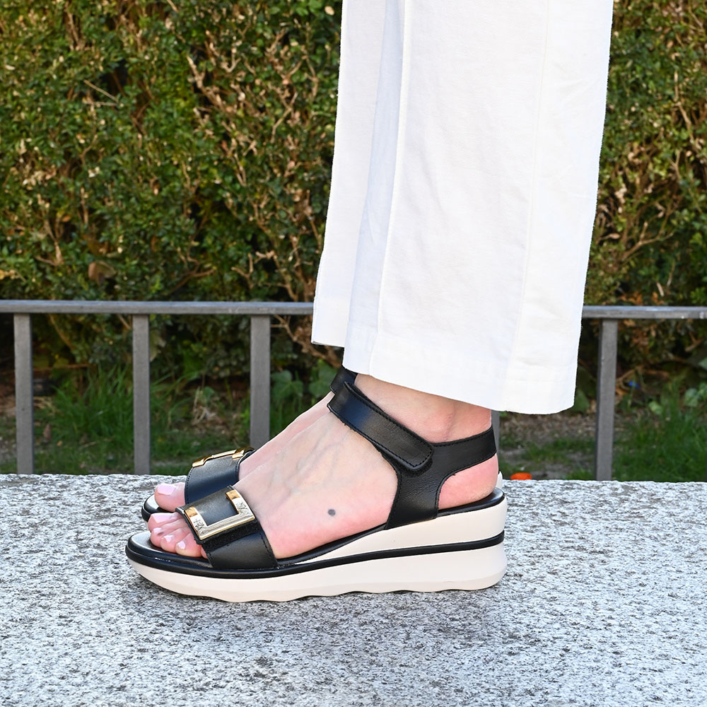 Las tiras principales están fabricadas con una piel napa negra con adorno metálico dorado en la pala que captura la luz con elegancia. Este acabado metálico refinado añade un toque de glamour a cualquier conjunto sin resultar excesivo.