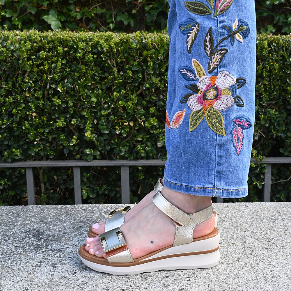 Las tiras principales están fabricadas con una piel dorada texturizada que captura la luz con elegancia. Este acabado metálico refinado añade un toque de glamour a cualquier conjunto sin resultar excesivo.