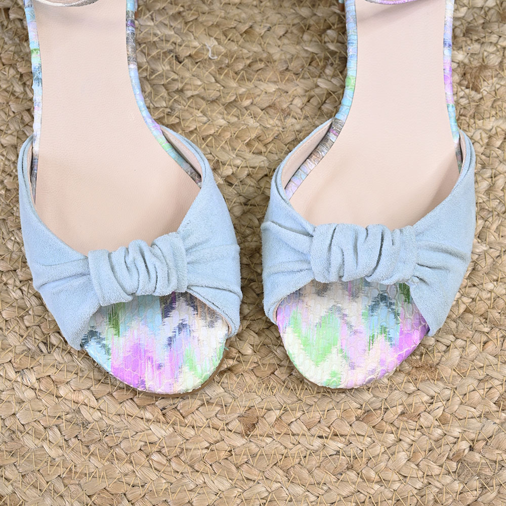 Su diseño es un juego de contrastes magnéticos y serenos: el ante en un delicado tono verde azulado pastel abraza el pie con la suavidad de una brisa, mientras que su tacón y puntera se convierten en un lienzo vivo. Un estampado de inspiración impresionista donde los lilas etéreos, los azules glaciar y los mentas suaves se entrelazan como la luz refractada en un cristal de hielo.