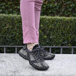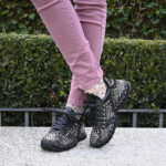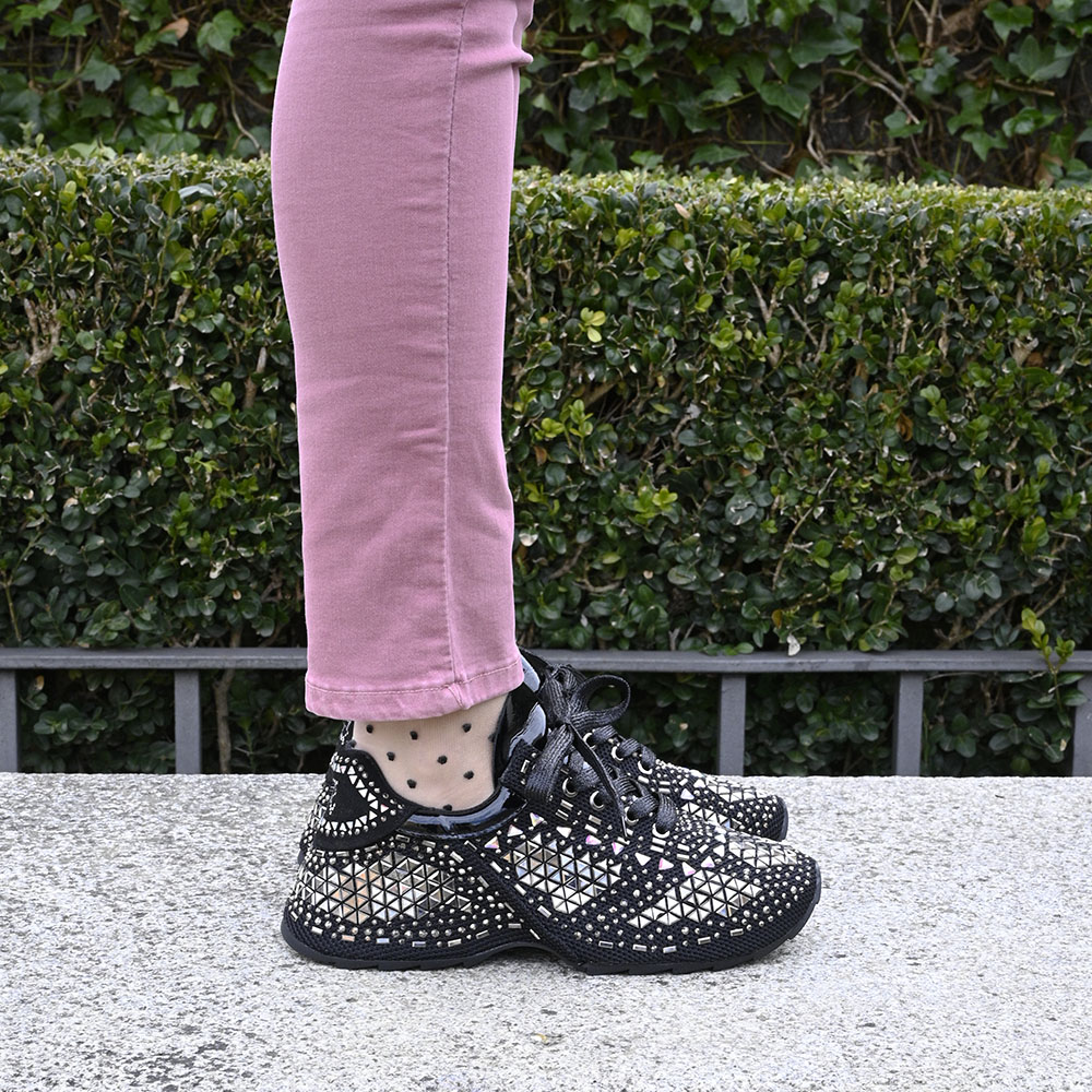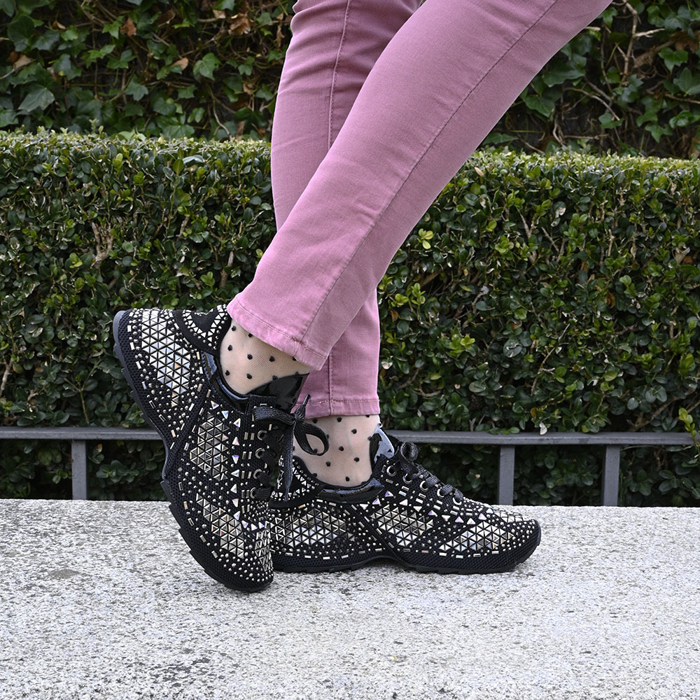 Mirror es una extrovertida deportiva con cuña interna de 5cm confeccionada en piel y tejido negro adornado por centenares de pequeños brillantes que recrean un mosaico junto a otras piezas rectangulares de efecto espejo. Sin duda, un diseño y estilo único e incomparable.