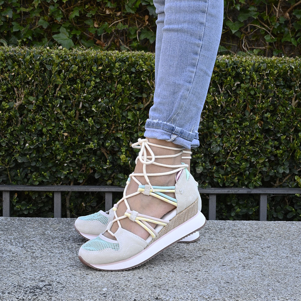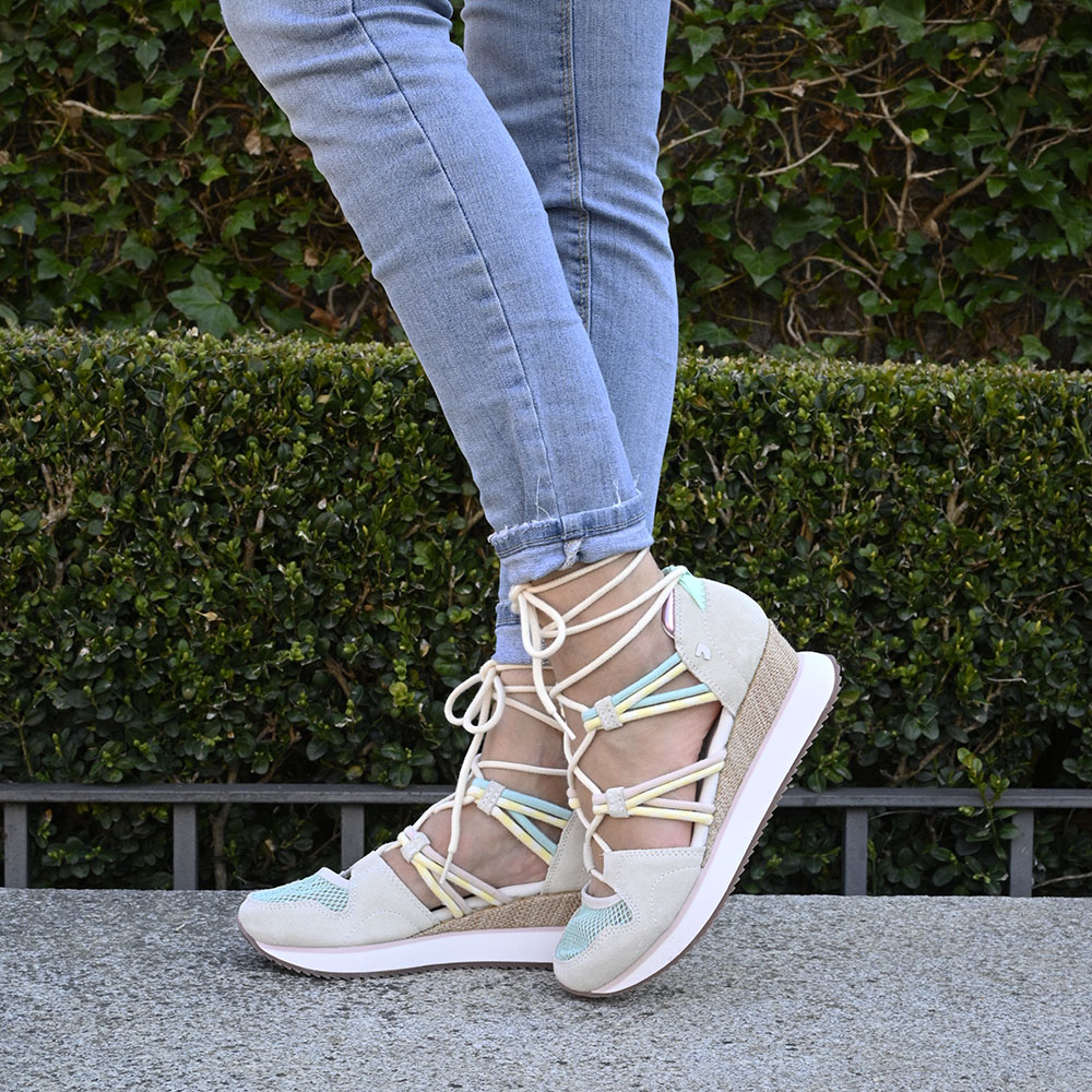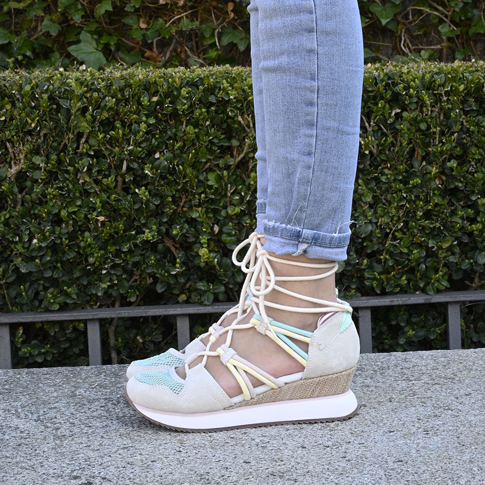 Sus cordones se entrelazan abrazando el empeine, permitiendo un ajuste personalizado que evoca las clásicas alpargatas, pero con un soporte moderno.