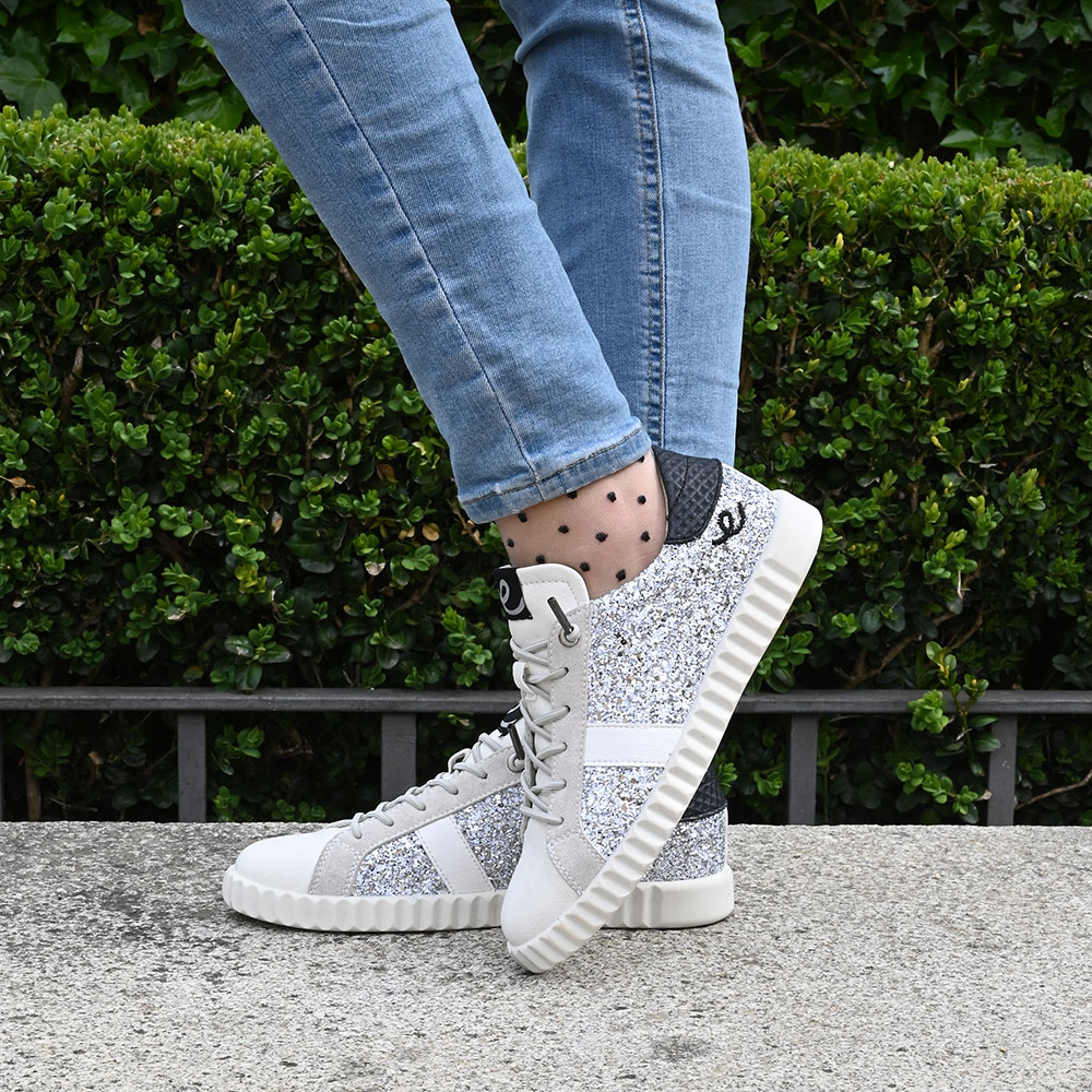 Su cuerpo está cubierto por una deslumbrante galaxia de confeti plateado que captura y refracta la luz con cada paso. Contrarrestamos este fulgor con piezas de efecto serraje en un tono gris suave, y efecto napa blanca texturizada en puntera, creando un equilibrio táctil y visual perfecto.