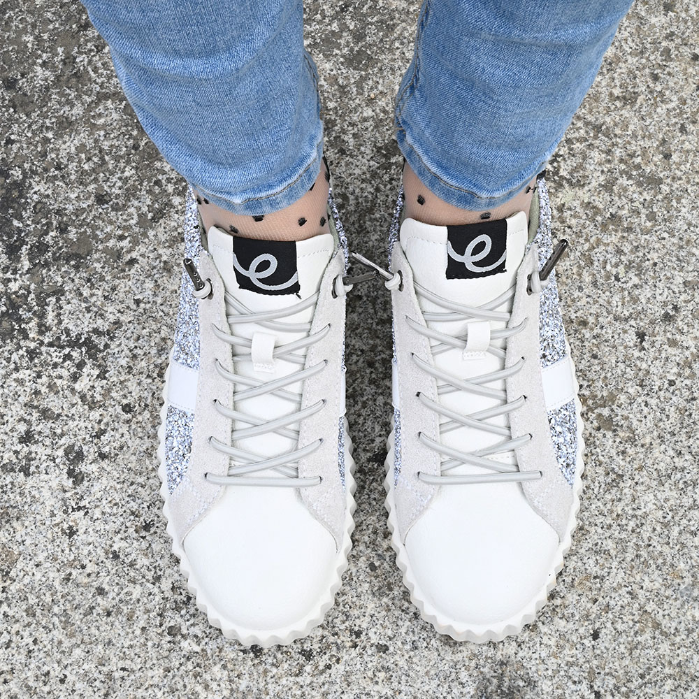 Los detalles son los que escriben su historia: los cordones elásticos beige se deslizan a través de ojales plateados y se aseguran un ajuste sin esfuerzo que parece mágico.