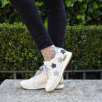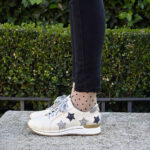 Adorna la talonera un pieza en piel de pelo de potro blanca con estampado de motitas multicolores tornasoladas enmarcada con glitter azul marino y tonos rosados. Luce en su lateral exterior tres vistosas estrellas en total sintonía, la central a juego con el glitter de la talonera, y las otras dos en glitter plateado.